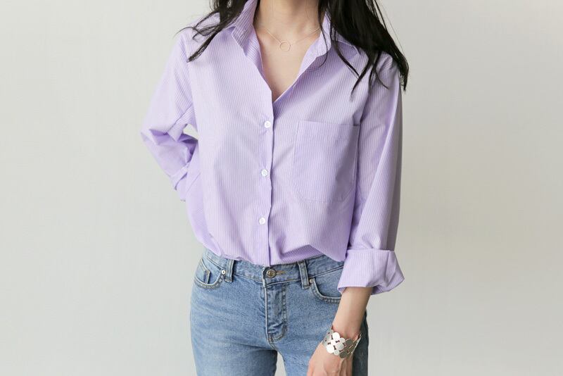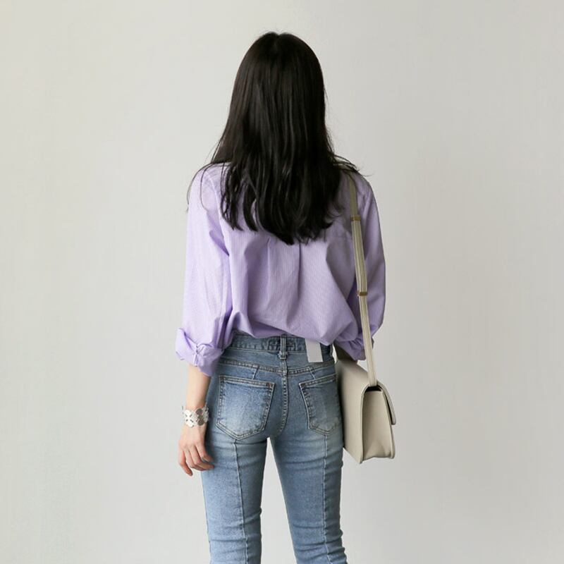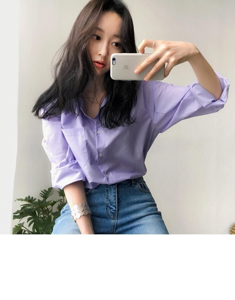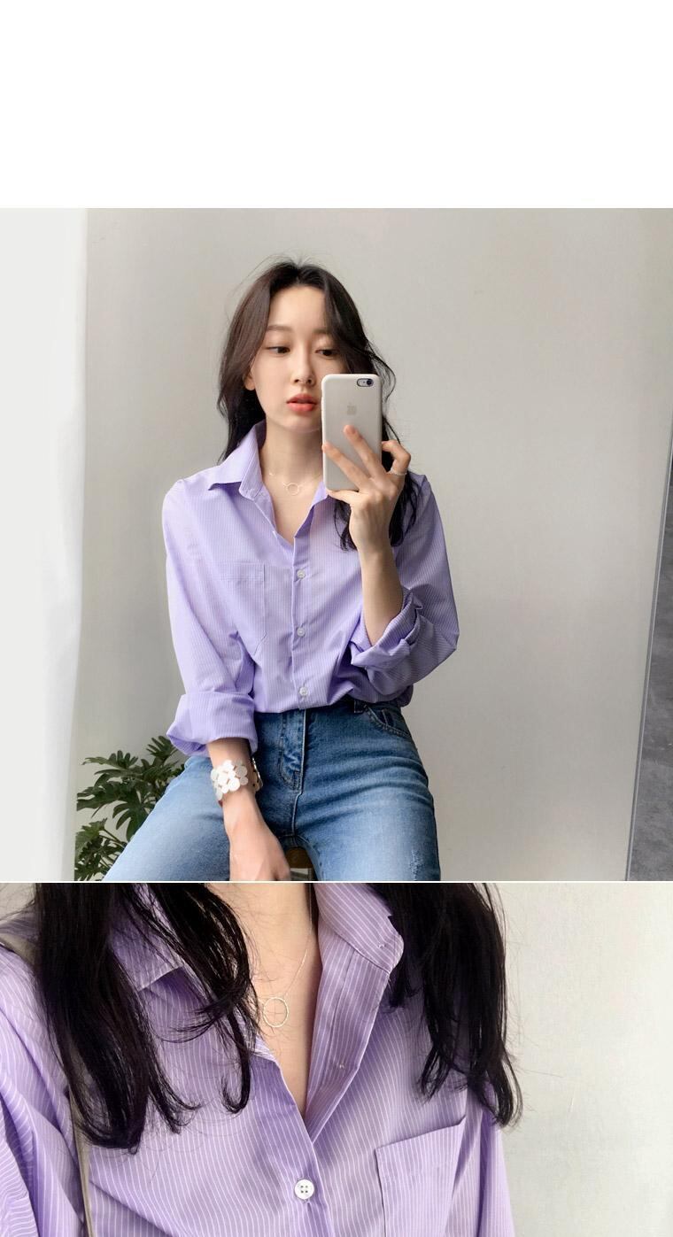 スプリングスタンダードシャツ ストライプ ロング レトロ 春物 パープル 左左右右9743806