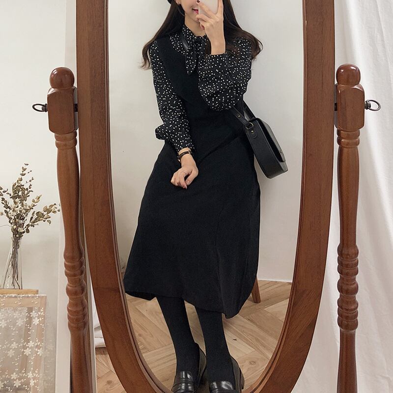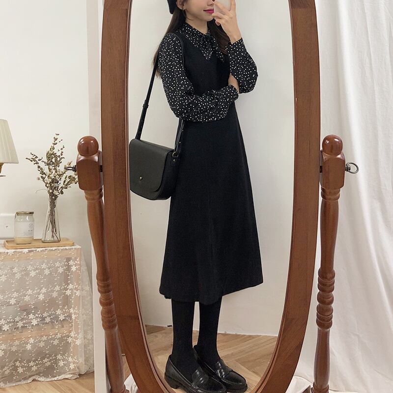 オータムウィンタースタンダードスカート スタイル薄手ブラックウェストドレス レトロ 秋物 冬物 左左右右6801470