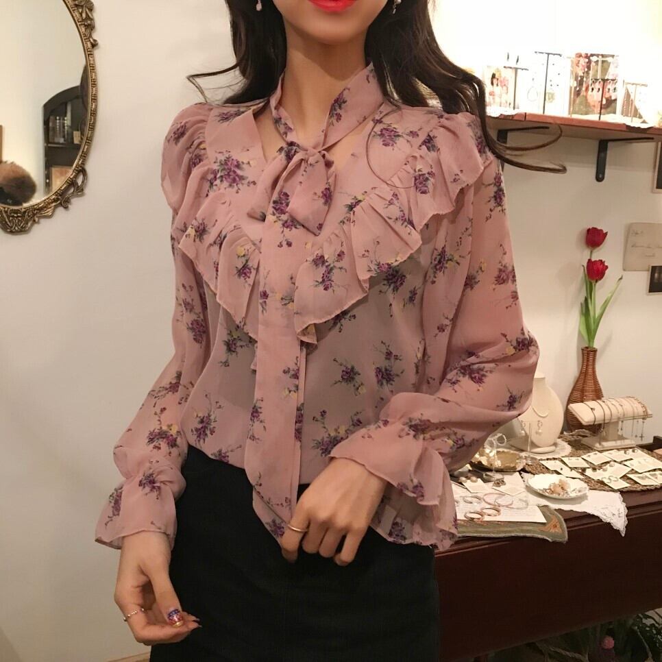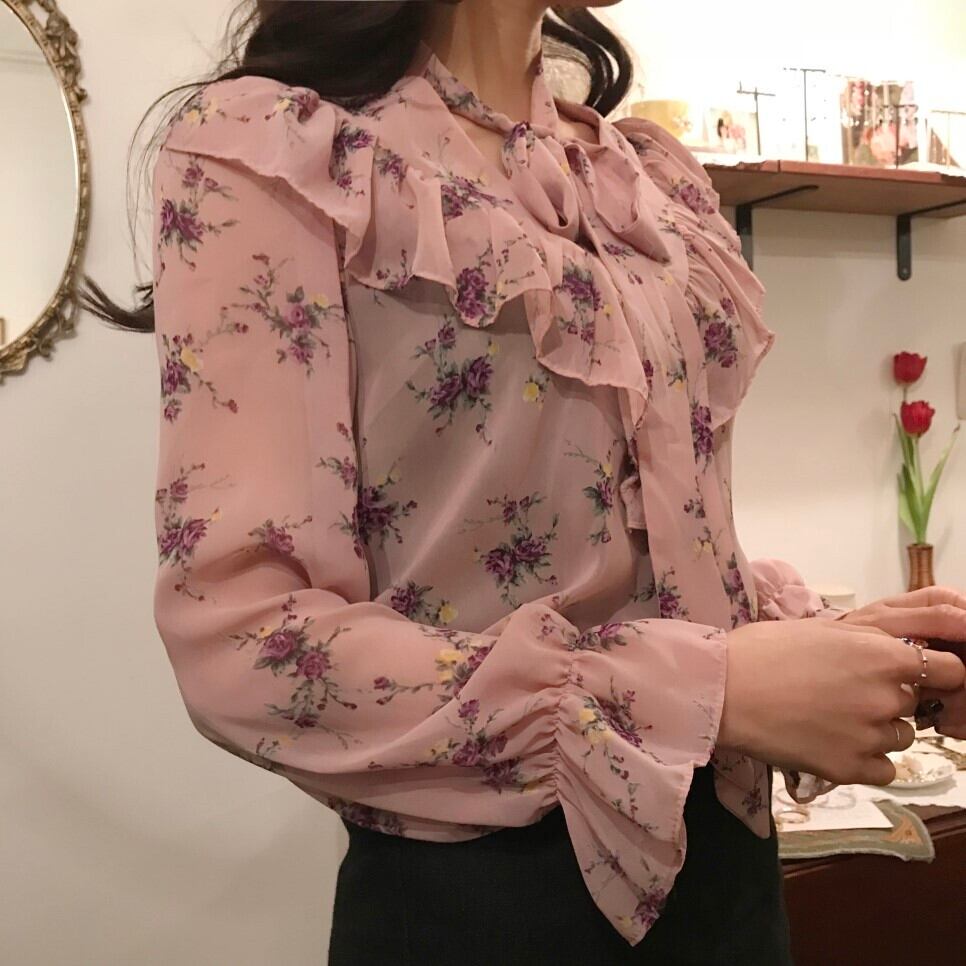 スタンダードシャツ リボンフローラル ピンク レトロ 大人ガーリー スウィート キュート カジュアル 花柄 左左右右0192854