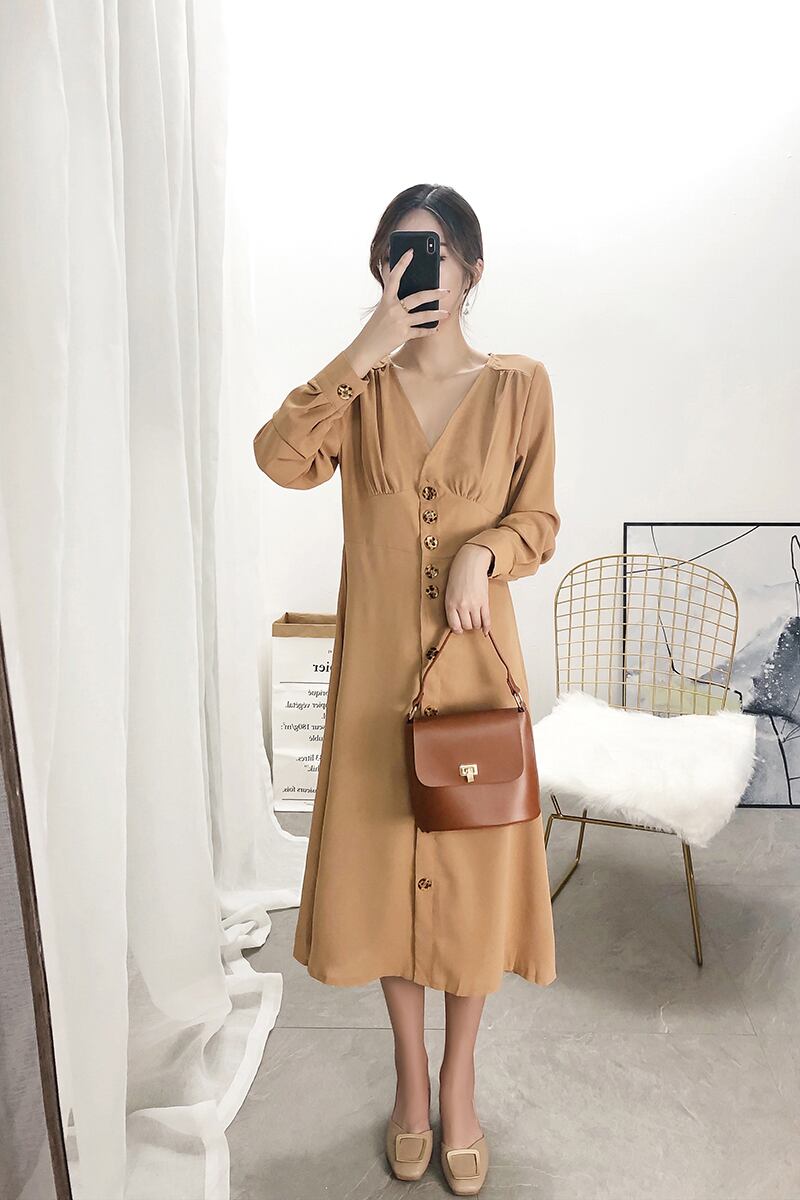スプリングオータムVネックドレス スタンダードスカート ウェストスタイル レトロ 春物 秋物 フラワーデザイン 左左右右3608984