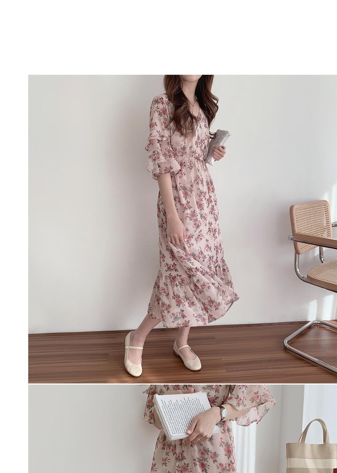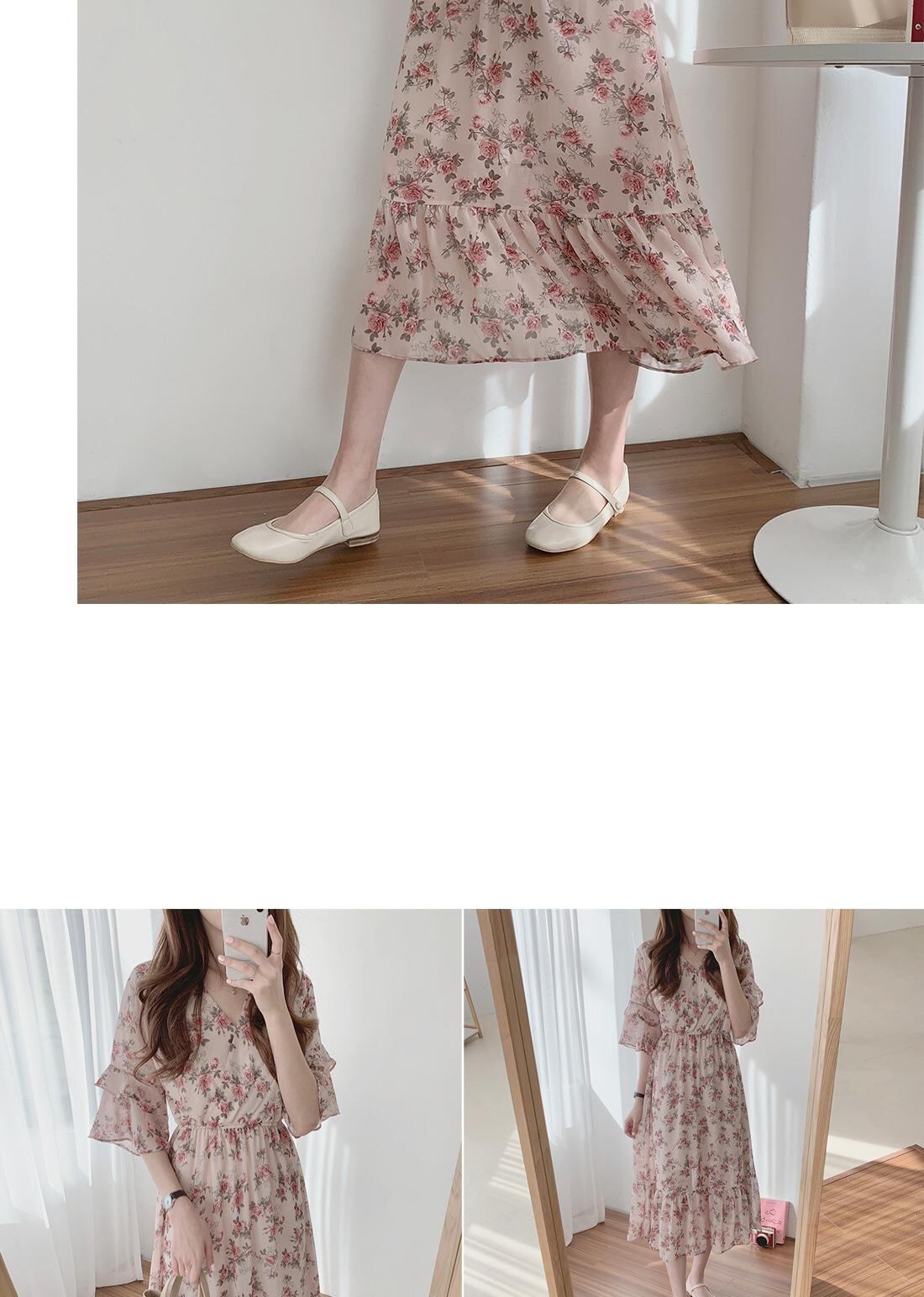 サマースタンダードスカート フローラルVネックシフォンドレス レトロ 夏物 花柄 左左右右4802631