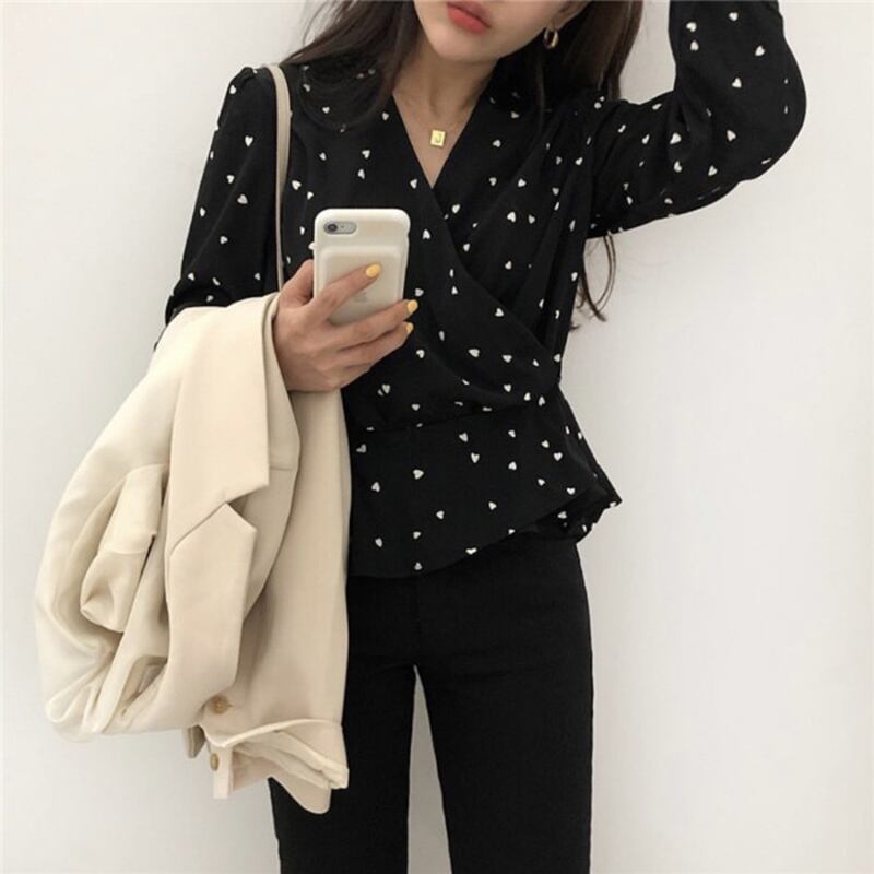 スプリングシフォンプリントトップス スタンダードVネック長袖スリーブショートシャツ ロング レトロ 春物 ICC_レディース0781103