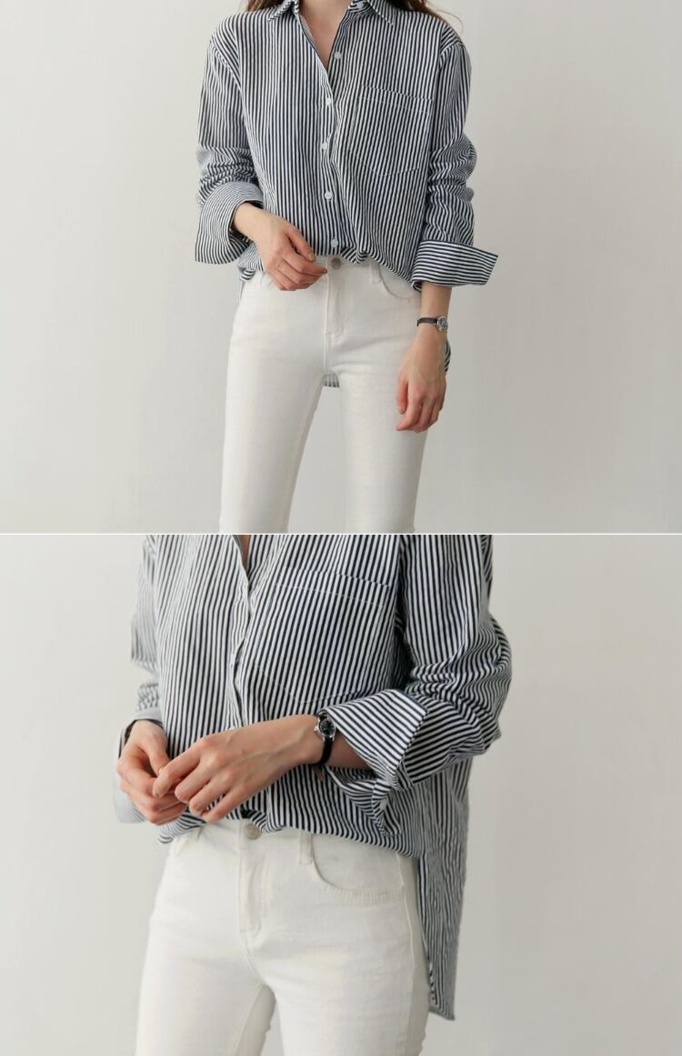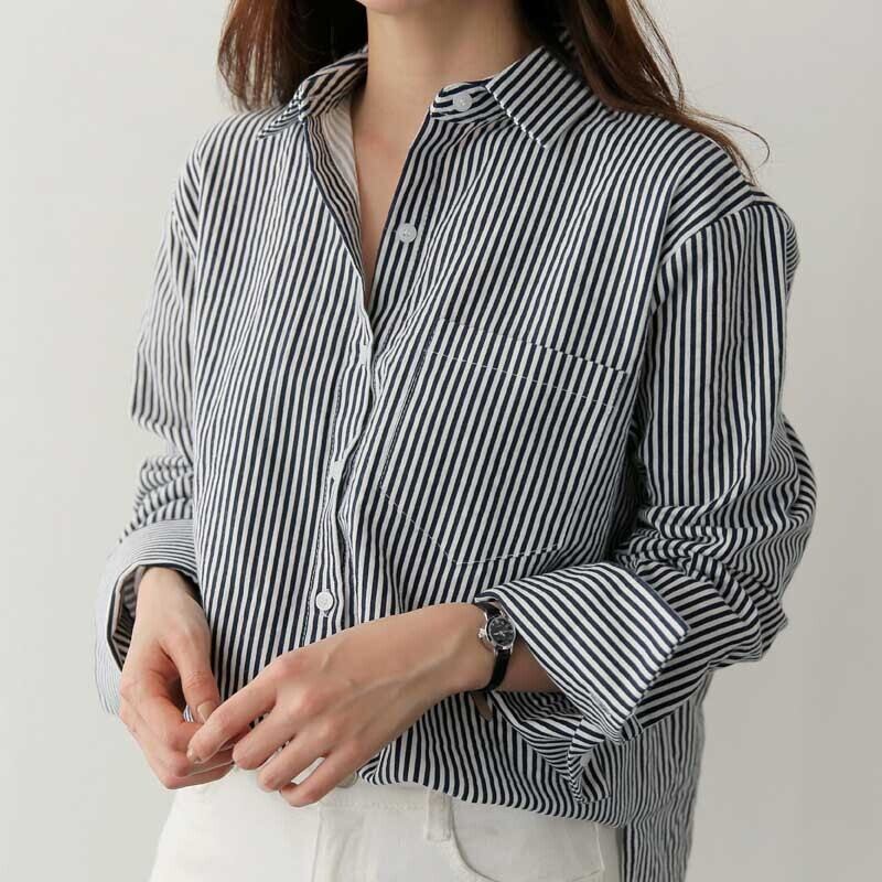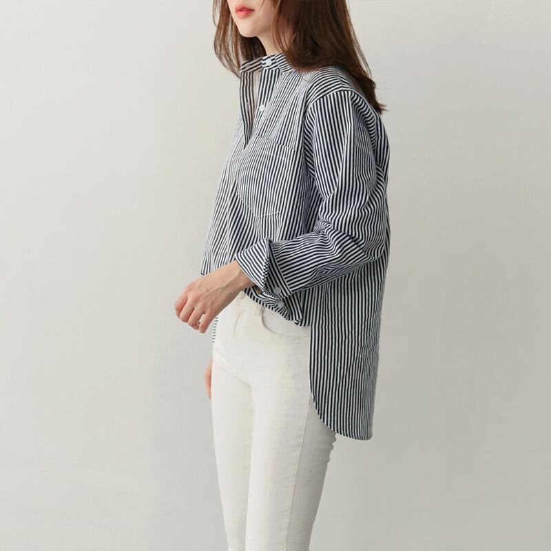 スプリングルーズストライプシャツ スタンドカラーカラーカジュアル 春物 左左右右_复古定制0693871
