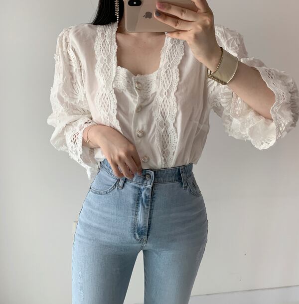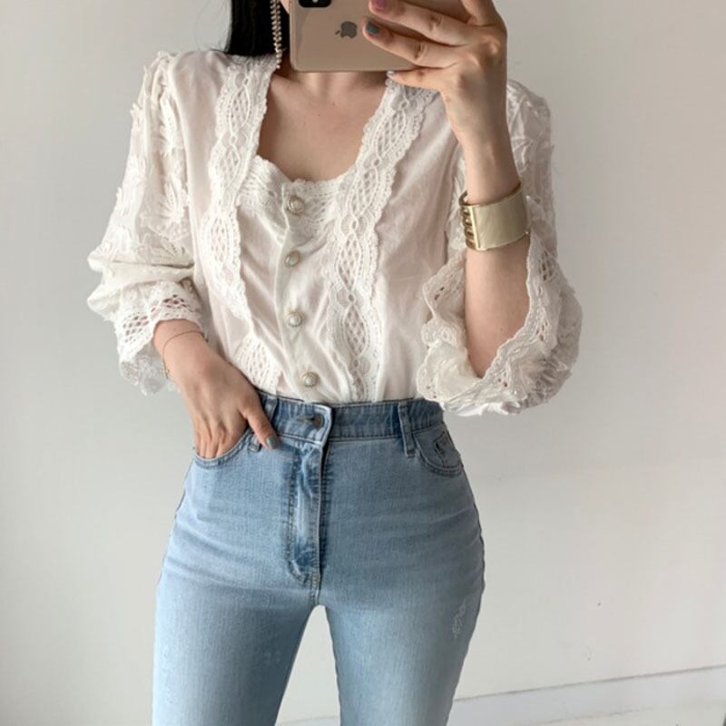 オータムスタンダードジャカードレースカラーシャツ トップス ロング レトロ 秋物 スクウェア ICC_レディース6507749