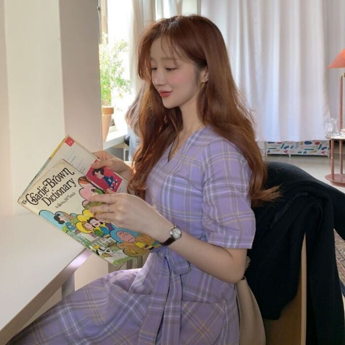 サマースタンダード格子柄ウェストVネックドレス ロングAラインスカート レトロ 夏物 ICC_レディース0369079