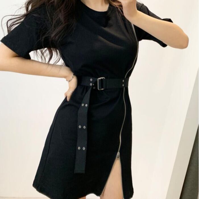 スタンダードブラックTシャツ スカート ドレス サマーウェストジッパー レトロ レース 夏物 レースアップ ICC_レディース4780028