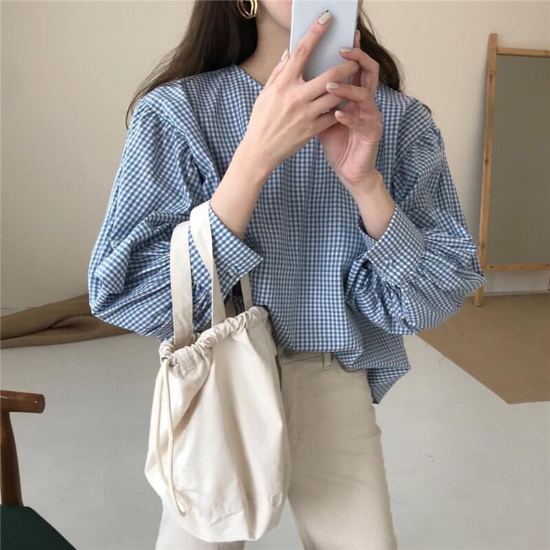 サマートップス シャツ 格子柄スリーブ長袖 ロング ランタンスリーブ 大人ガーリー スウィート キュート カジュアル 夏物 ICC_レディース8983713