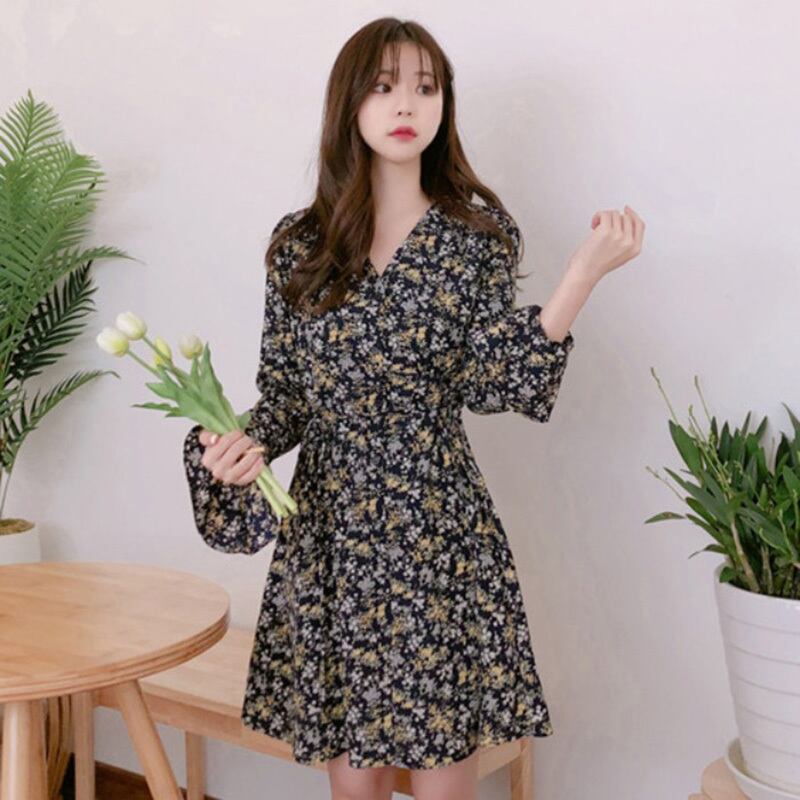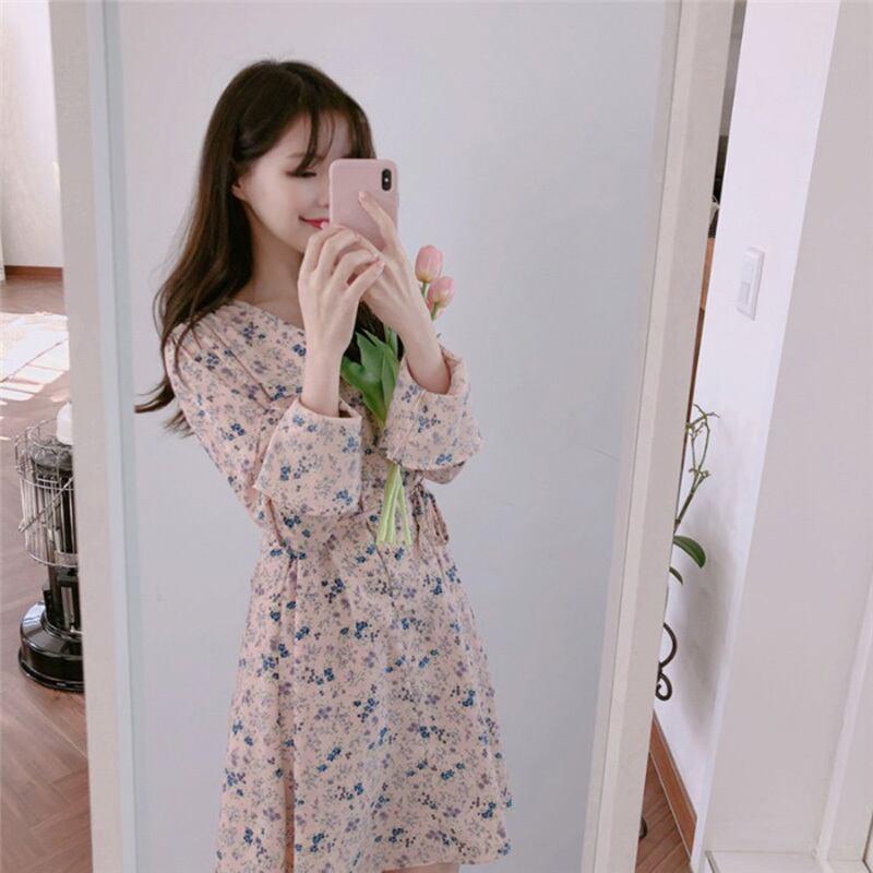 シフォンスカート オータムスタンダードVネック長袖スリーブウェストフローラルドレス ロング レトロ 大人ガーリー スウィート キュート カジュアル 秋物 花柄 ICC_レディース1631495