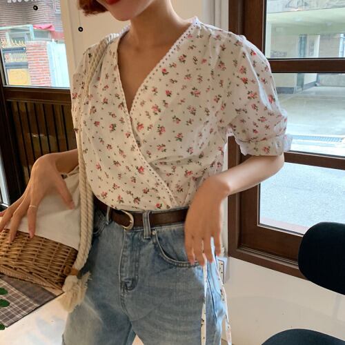 シャツ レースVネックフローラルレッド半袖スリーブ ショート ハーフスリーブ 花柄 レースアップ ICC_レディース5324086