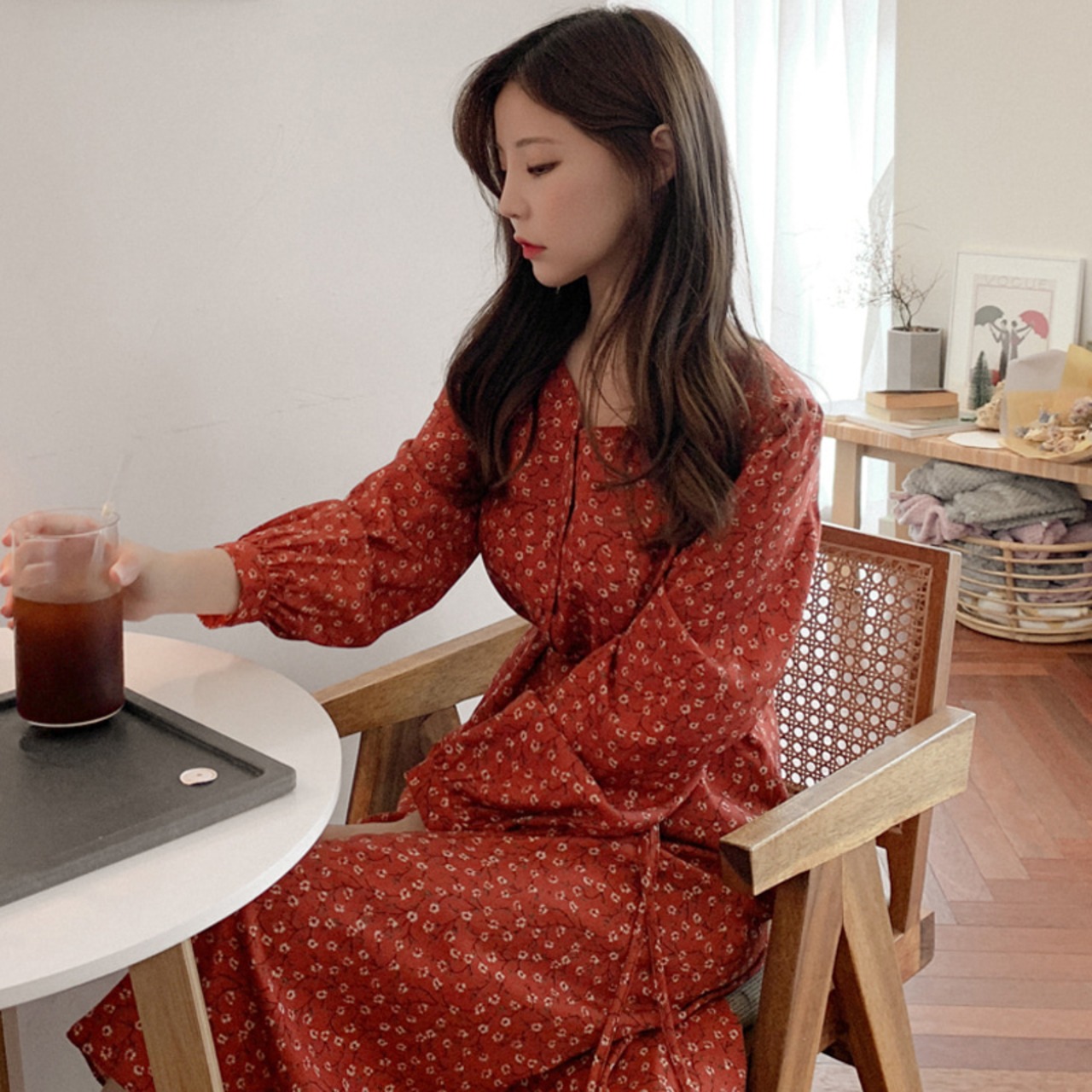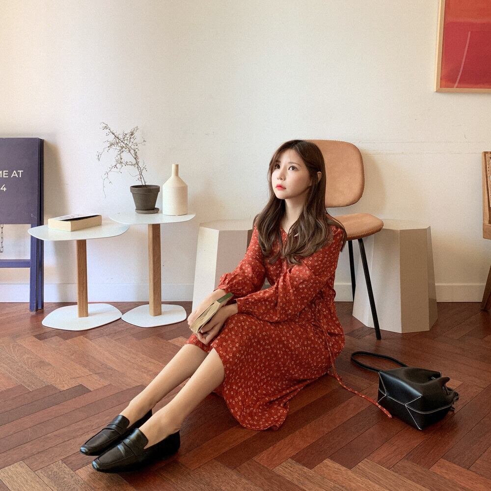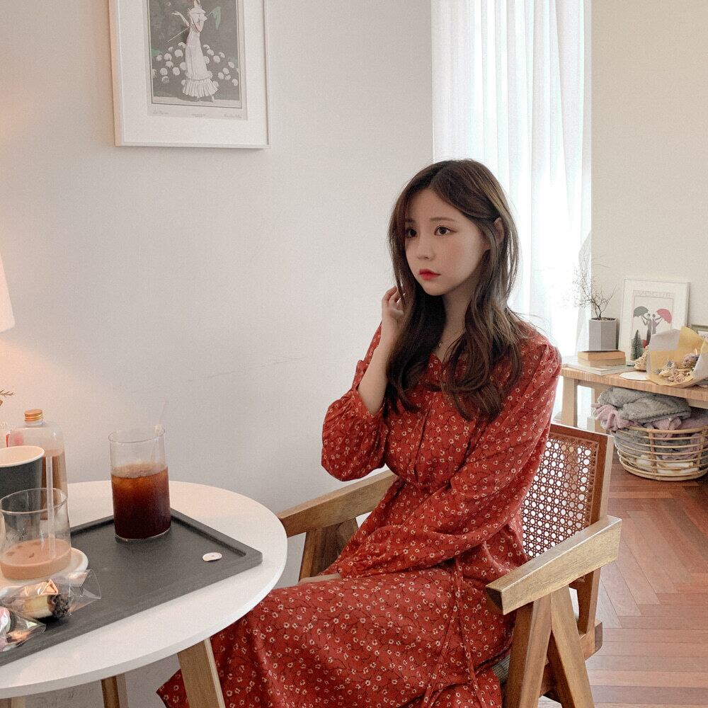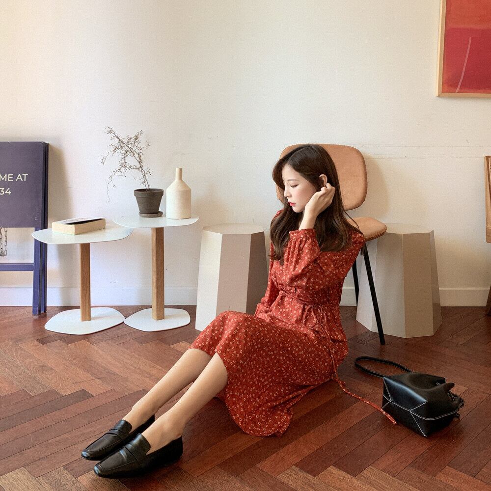 スタンダードスプリングオータムスカート フローラルウェストドレス ロング レトロ 大人ガーリー スウィート キュート カジュアル 春物 秋物 花柄 左左右右9034366