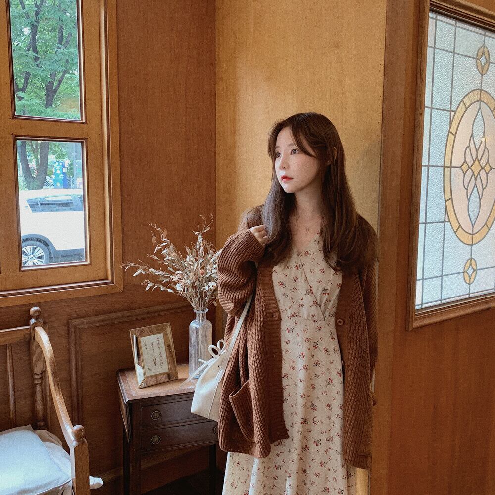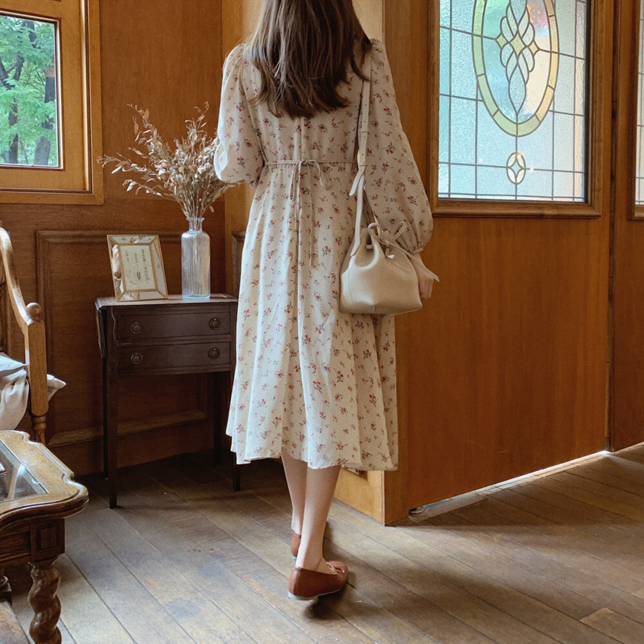 スプリングオータムスタンダードスカート ウェストフローラルVネックドレス ロング レトロ 春物 秋物 花柄 左左右右4606990