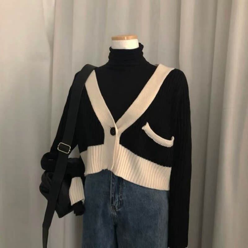 オータムスタンダードカラーショートハイウェストウェストニットセーター カーディガン レトロ 秋物 ICC_レディース7055509