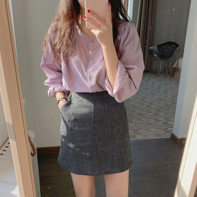 スプリングシャツ ハイウェストウェストポケット薄手スカート ロング 大人ガーリー スウィート キュート カジュアル 春物 パープル ICC_レディース0510836