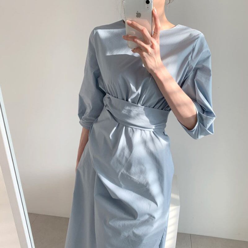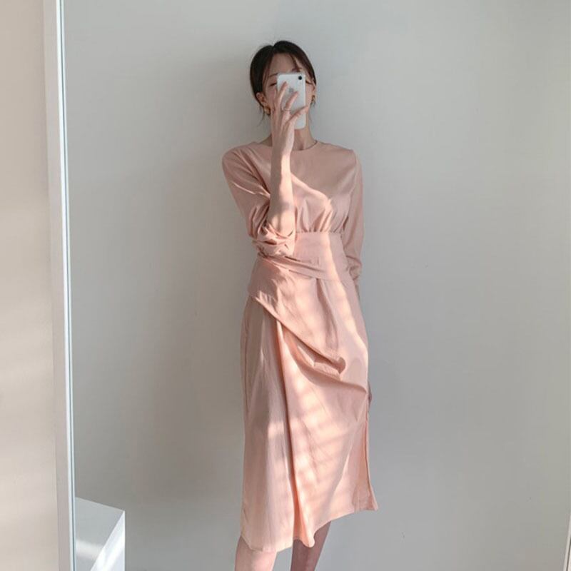 スタンダードラウンドネックプリーツスリムウェスト長袖スリーブドレス レディース ロング レトロ Oネック ICC_レディース0704532