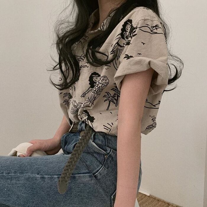 スタンダードプリントシャツ サマールーズレッドトップス レトロ 夏物 ICC_レディース7160958