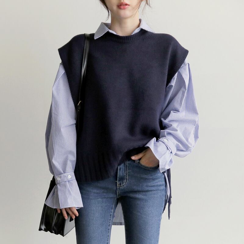 レトロ香港味シック2019春野生のラウンドネックベスト緩いレースアップセーターベストクリップニットベスト女性 スプリング 春物 Oネック 左左右右_复古定制1939990