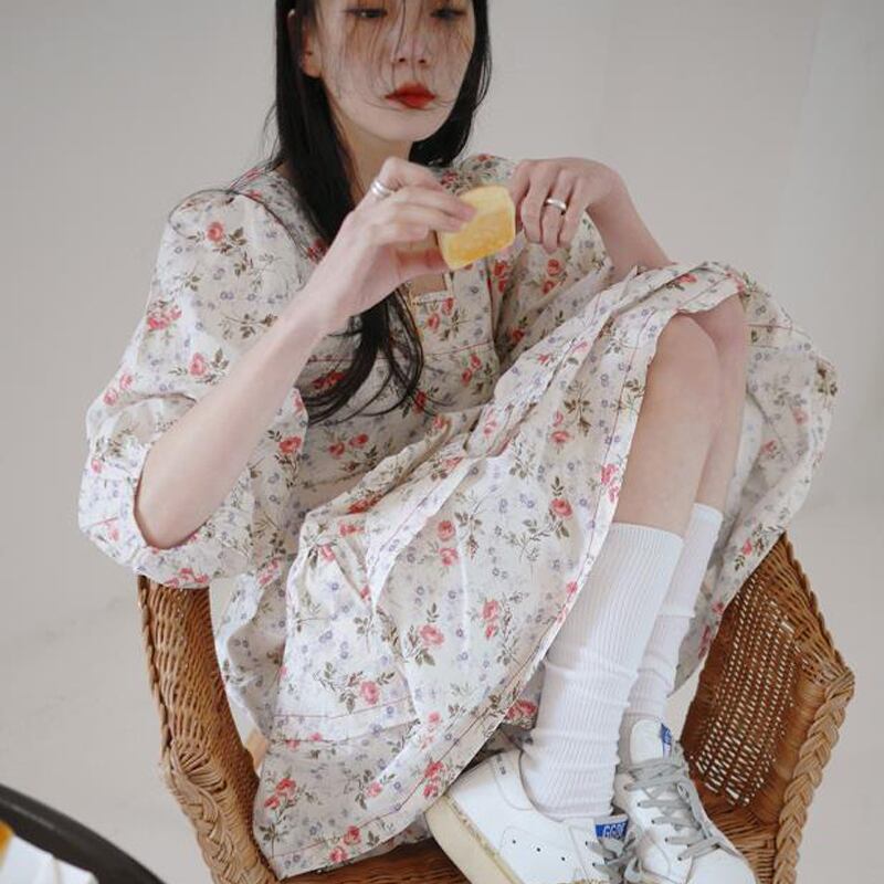 スタンダードフローラルカラーラインウェストベルト スリーブドレス レトロ ハーネス 花柄 スクウェア ICC_レディース6186036
