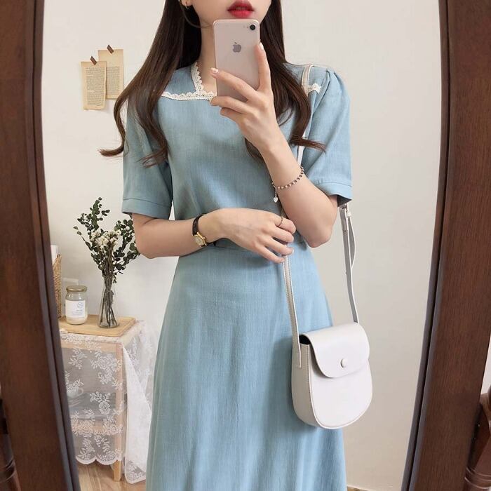 サマースタンダードウェストレースカラードレス 薄手ロング コットン レトロ 夏物 スクウェア ICC_レディース2749761