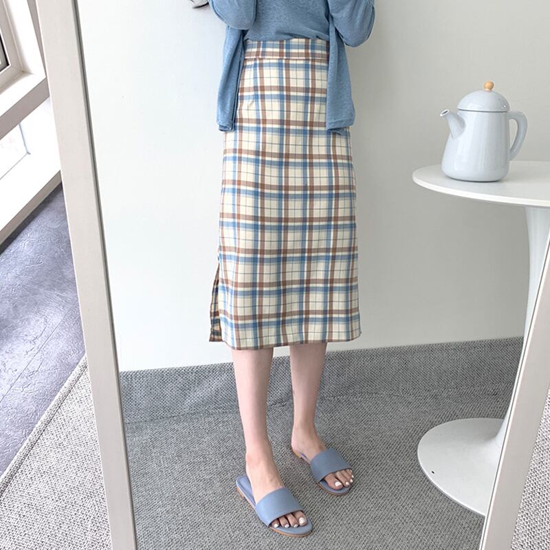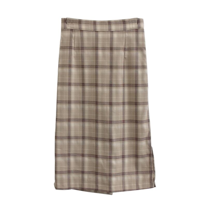 スプリングハイウェストウェストスリム格子柄スカート ロング 春物 左左右右2237844
