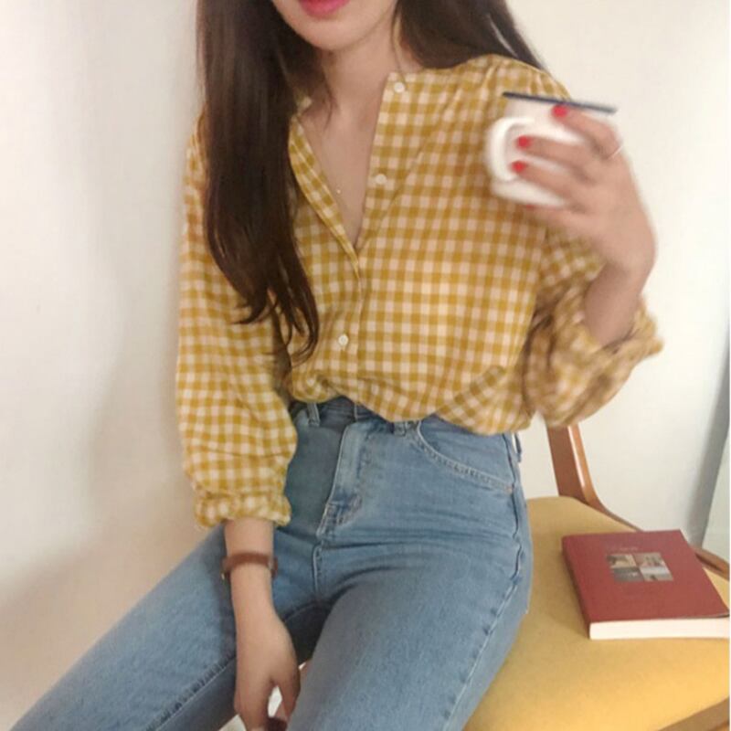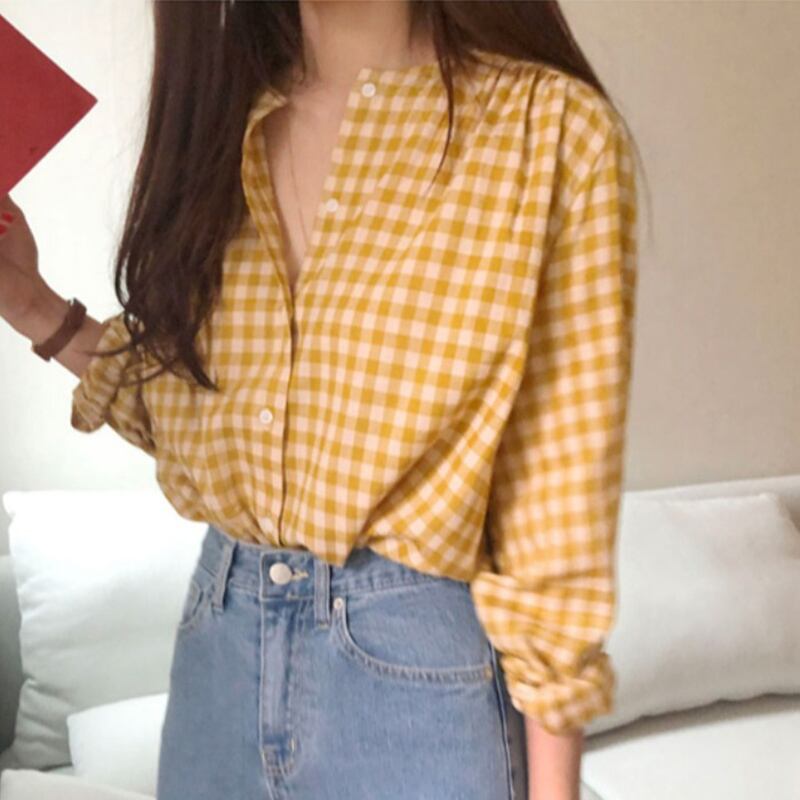 スプリングサマースタンダード格子柄シャツ スリムルーズ ロング コットン レトロ 春物 夏物 ICC_レディース7293425