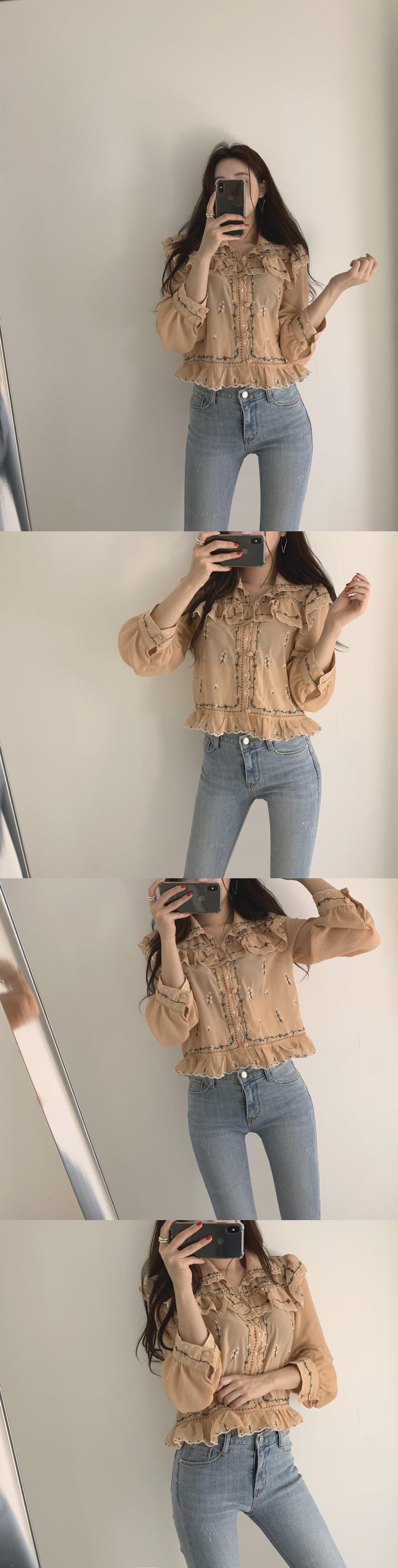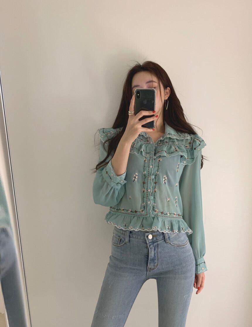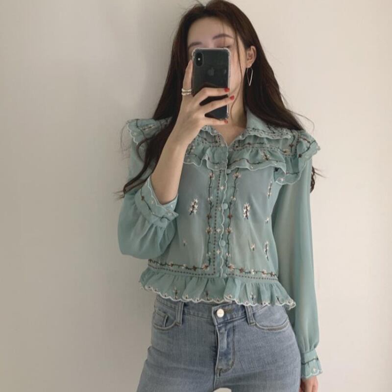 オータムウィンタースタンダード刺繍シャツ ハイウェストウェストシフォン レトロ 秋物 冬物 ステッチ ICC_レディース8350945