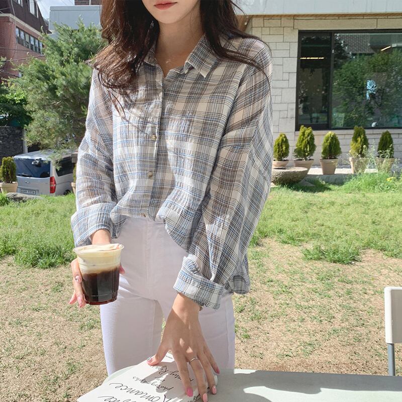 レトロシックなシンプルなルーズ長袖シャツ小さな新鮮な日焼け止めカーディガン野生の学生の格子縞のシャツ ロング 左左右右_复古定制3902086
