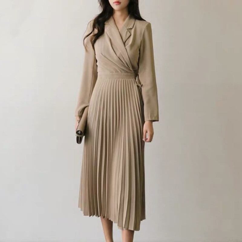オータムソリッド カラールーズウェストプリーツスカート 薄手ロングドレス 秋物 ソリッドカラー ICC_レディース5715870
