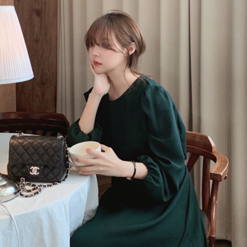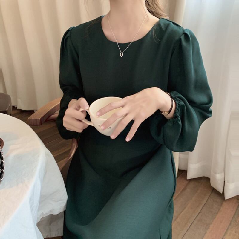 ラウンドネックウェストスカート オータムダークグリーン長袖スリーブドレス ロング 秋物 Oネック ICC_レディース2352124