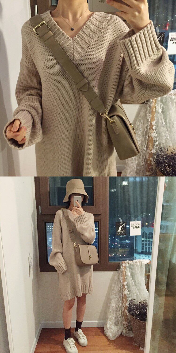 スタンダードスタイルウールセーター スプリングオータムVネックルーズニットジャケット レトロ 春物 秋物 ICC_レディース6009316
