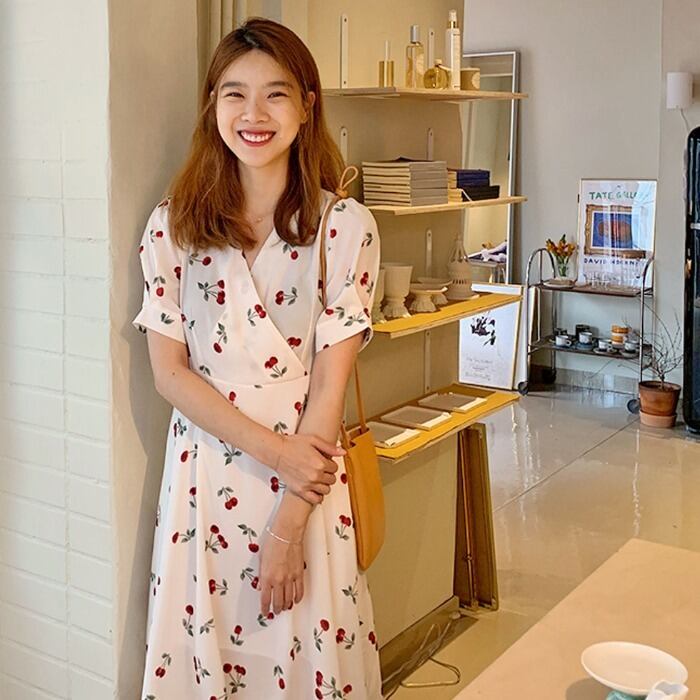 シフォンドレス スカート Vネックプリント柄半袖スリーブウェスト ショート ハーフスリーブ ICC_レディース5422014