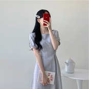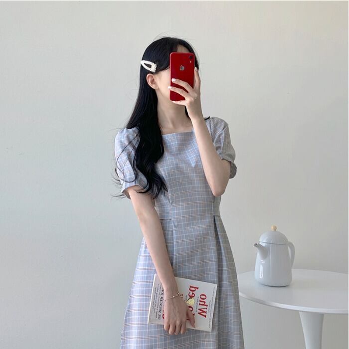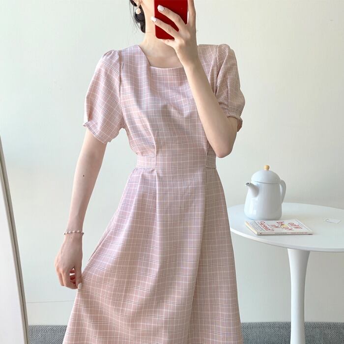 スタンダード格子柄ドレス ウェストAラインスカート レトロ フラワーデザイン ICC_レディース1298960