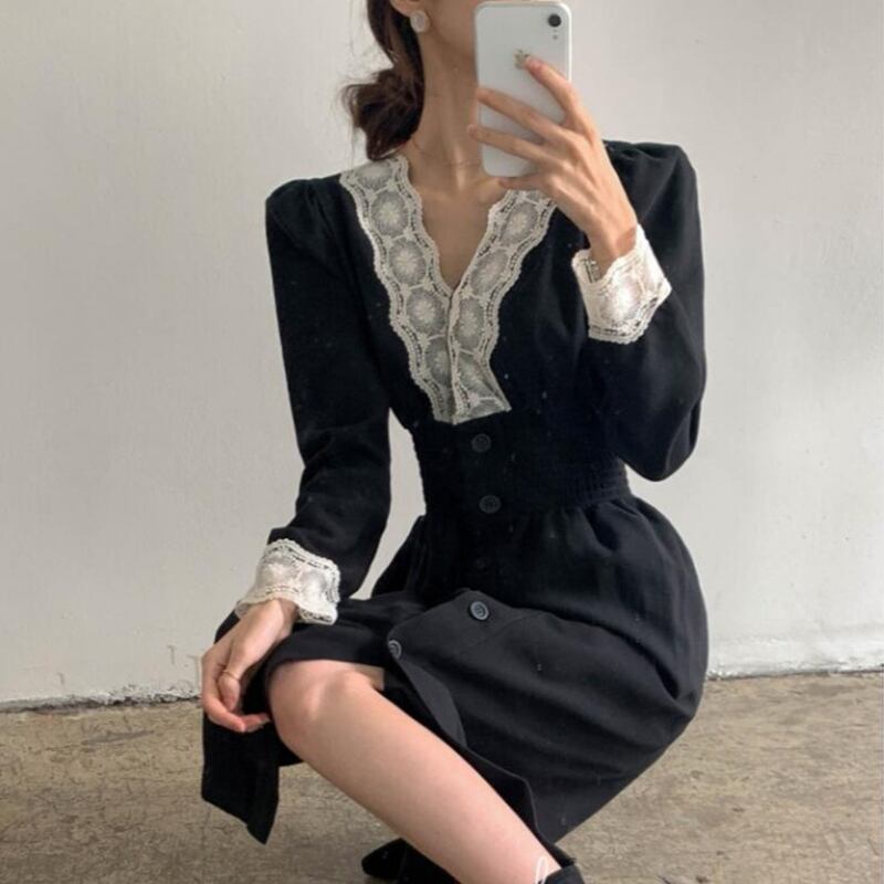 VネックレースFlowerデザイン スリムウェストドレス エレガント フラワーデザイン ステッチ ICC_レディース5252605