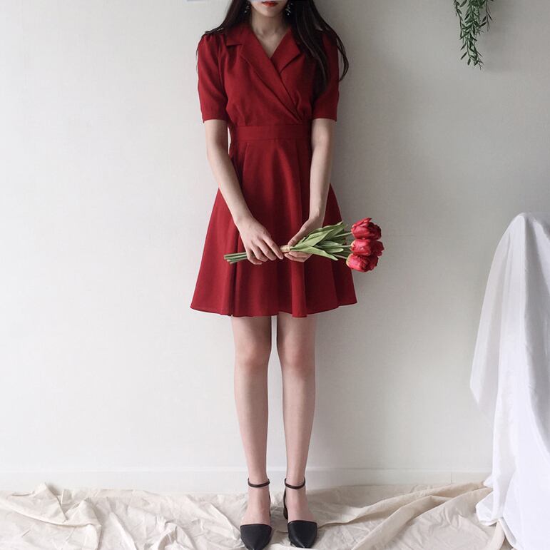 サマースタンダードスタイルレッドドレス Vネックウェストスカート レトロ 夏物 フラワーデザイン ICC_レディース9104061