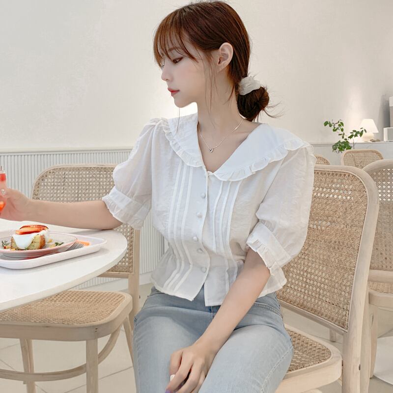 サマースタンダードトップス ソリッド カラーシャツ ショートレース レトロ 大人ガーリー スウィート キュート カジュアル 夏物 ソリッドカラー 左左右右4787519