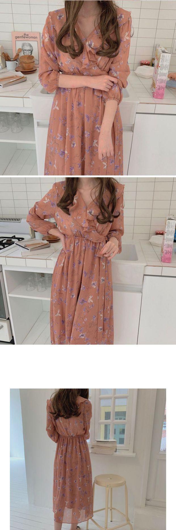 春と秋のレトロな妖精ファンシックな穏やかなスカート最初の愛風蓮の葉Vネックシフォン花柄ドレス スプリング 春物 オータム 秋物 左左右右_复古定制3544630