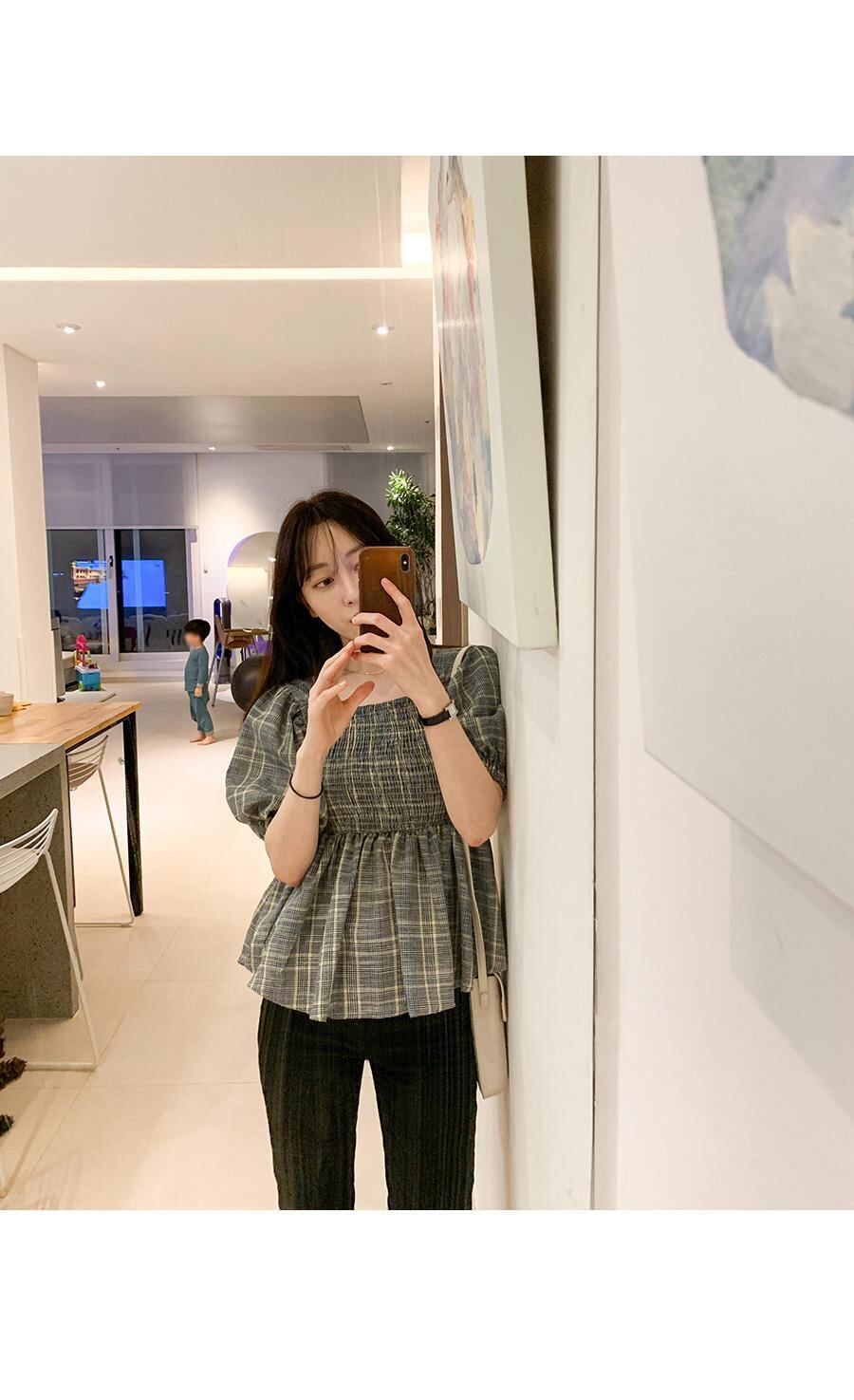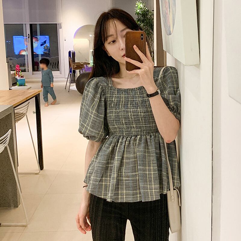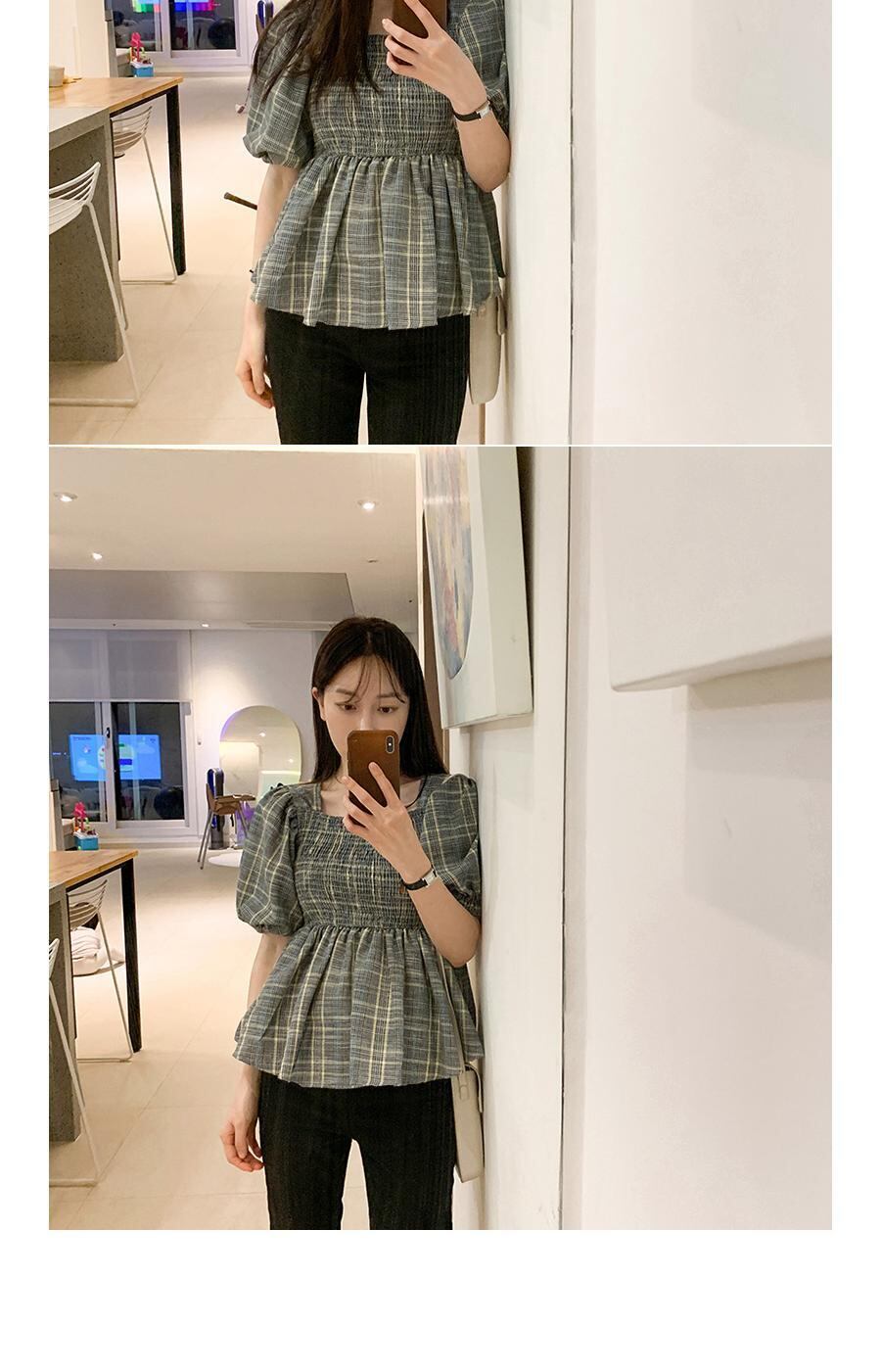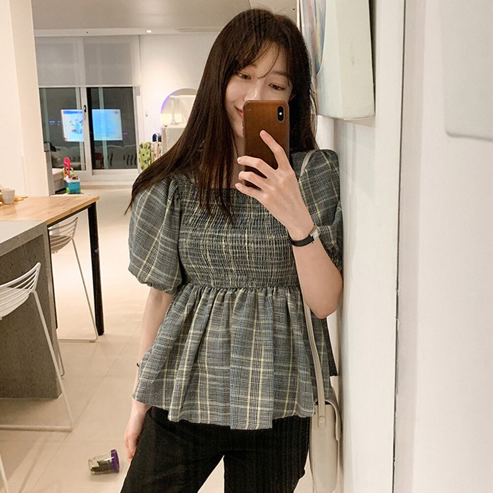 レトロなウエストパフスリーブトップ夏デザインセンスニッチ小さなシャツスクエアカラー学生は薄い格子縞のシャツ サマー 夏物 スクウェア 左左右右_复古定制7635488