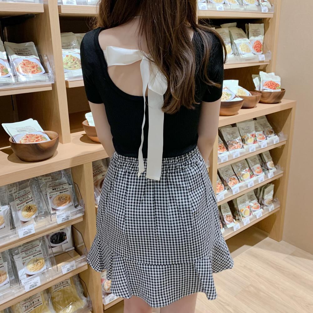 insレトロソフト姉妹蝶ネクタイブラックワイルドスリムホルターセーターの学生は薄いTシャツの女性でした リボン 左左右右_复古定制3009917