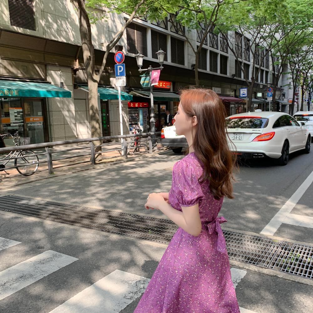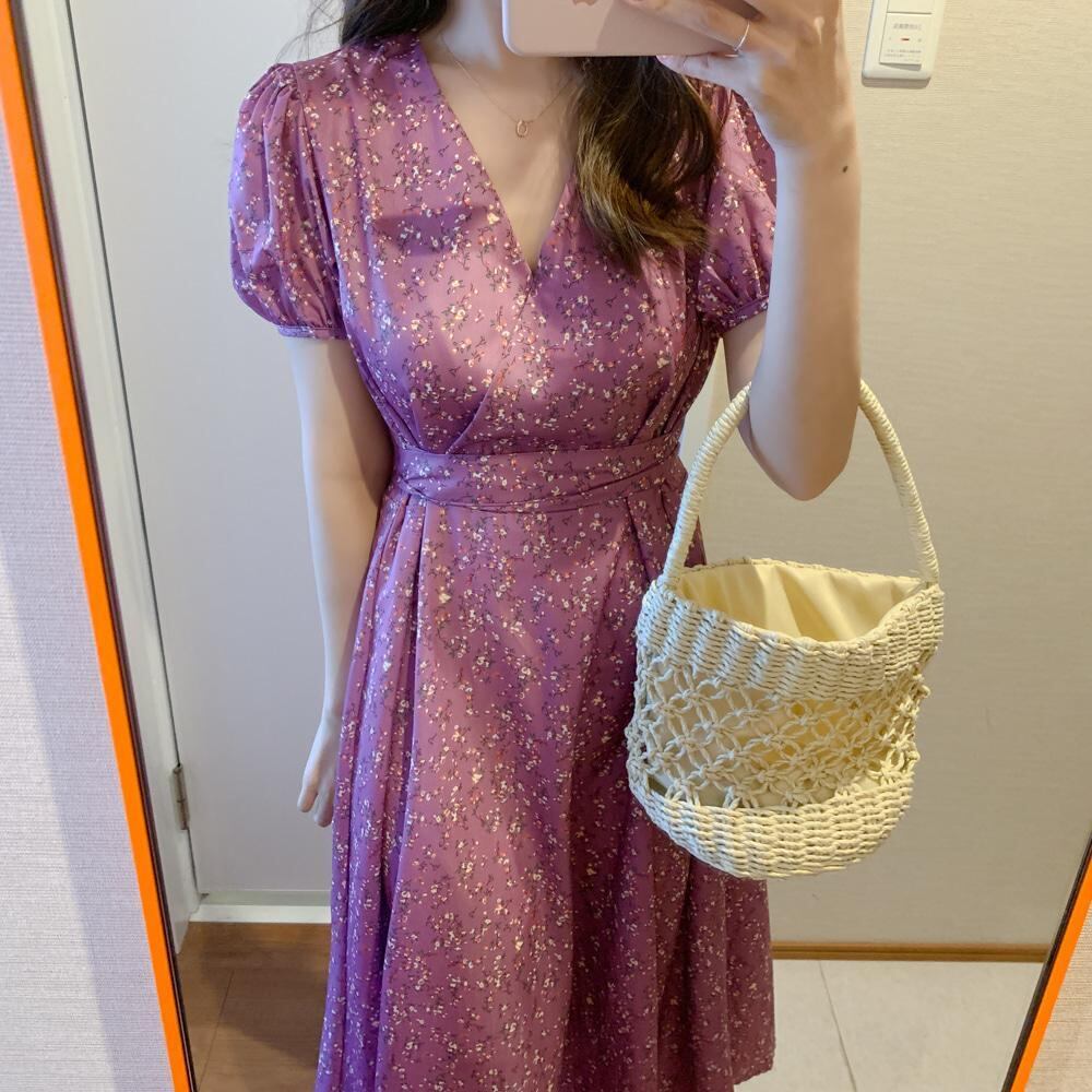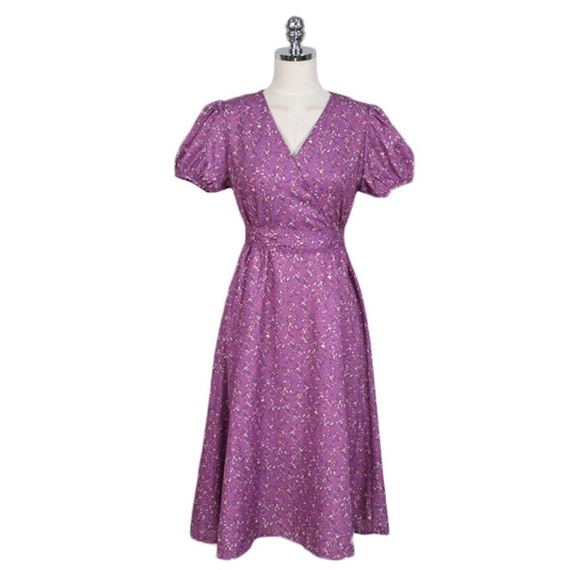 スタンダードスカート サマーウェストフローラルVネックドレス レトロ 夏物 花柄 フラワーデザイン パープル 左左右右9269240