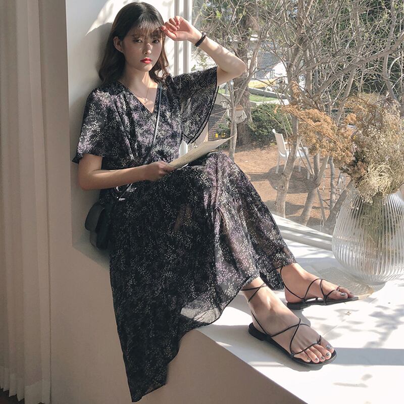 サマースタンダードスカート ロングVネックフローラルシフォンドレス レトロ 夏物 花柄 左左右右3985960