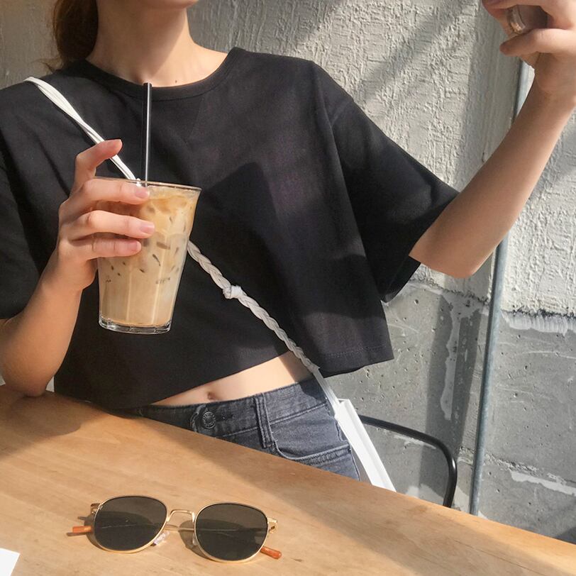 サマースタンダードラウンドネックハイウェストウェストショートルーズ半袖スリーブシャツ Tシャツ レトロ ハーフスリーブ 夏物 Oネック ICC_レディース1961144