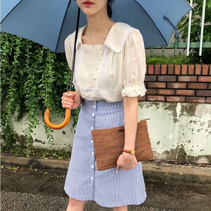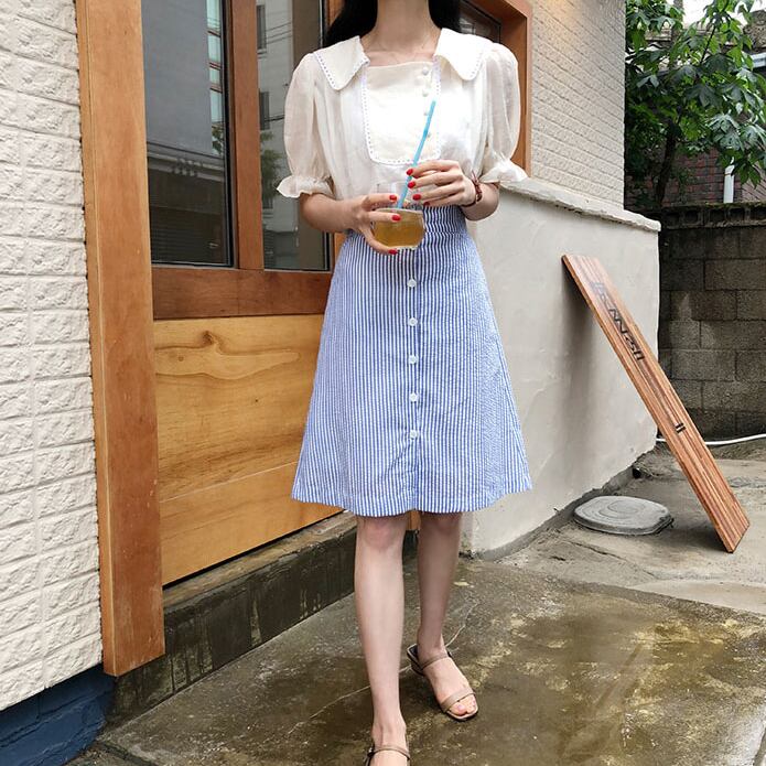 スタンダードカラーシャツ ストライプハイウェストウェストスカート レトロ スクウェア ICC_レディース4382137