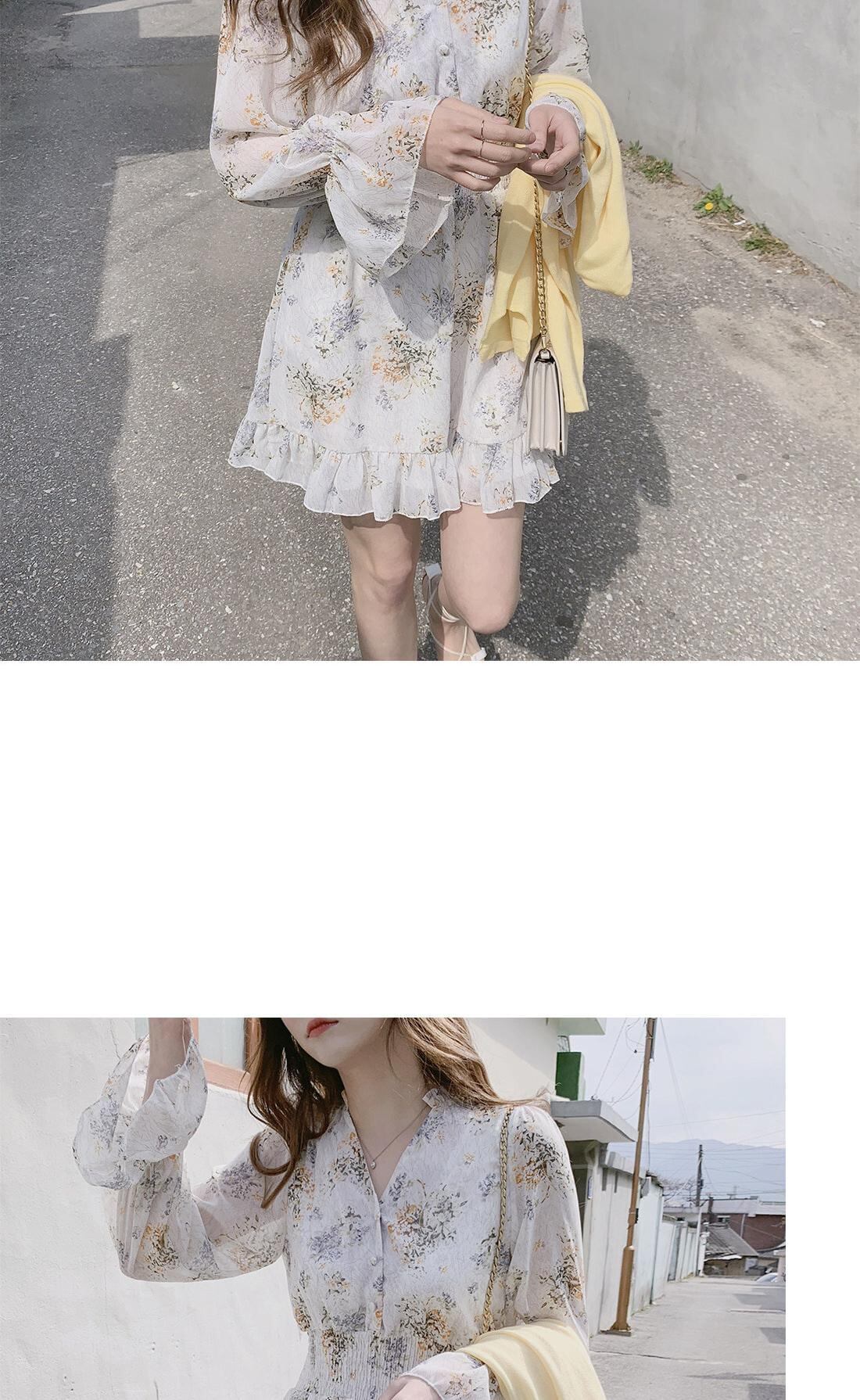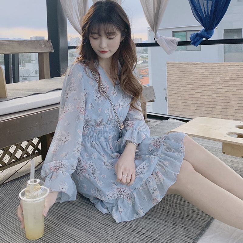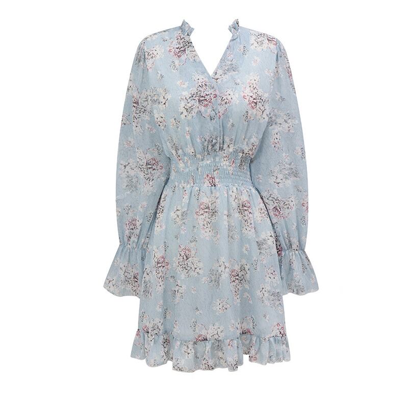 サマースタンダードスカート ハイウェストウェストVネックフローラル薄手ドレス レトロ 夏物 花柄 左左右右9075876