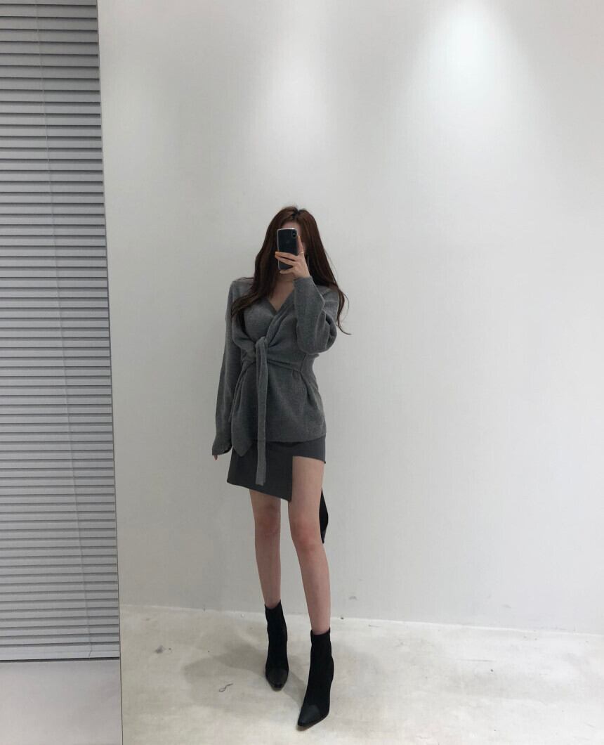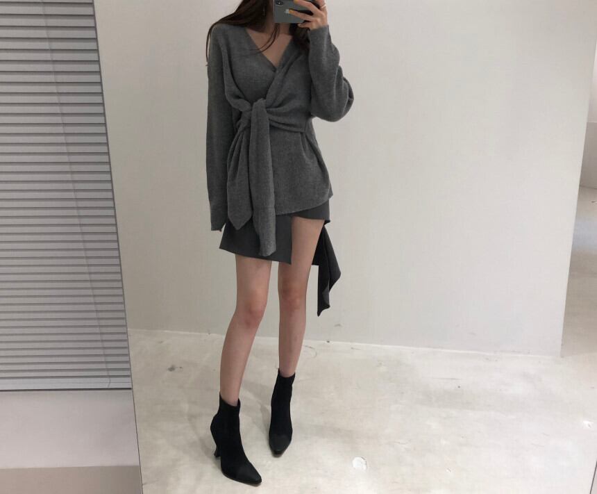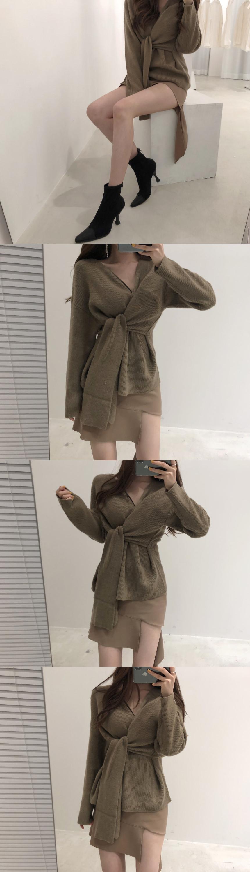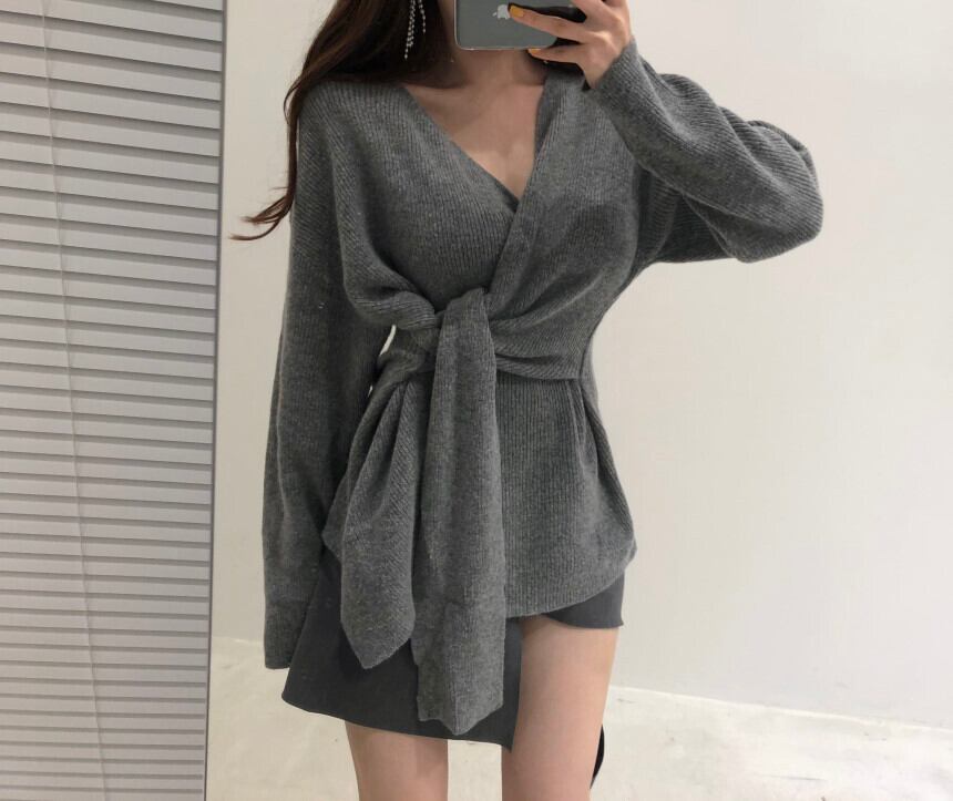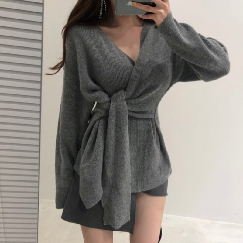 オータムVネックスリム薄手サイドバンドウェスト長袖スリーブセーター レディース ロング 秋物 ICC_レディース8571814