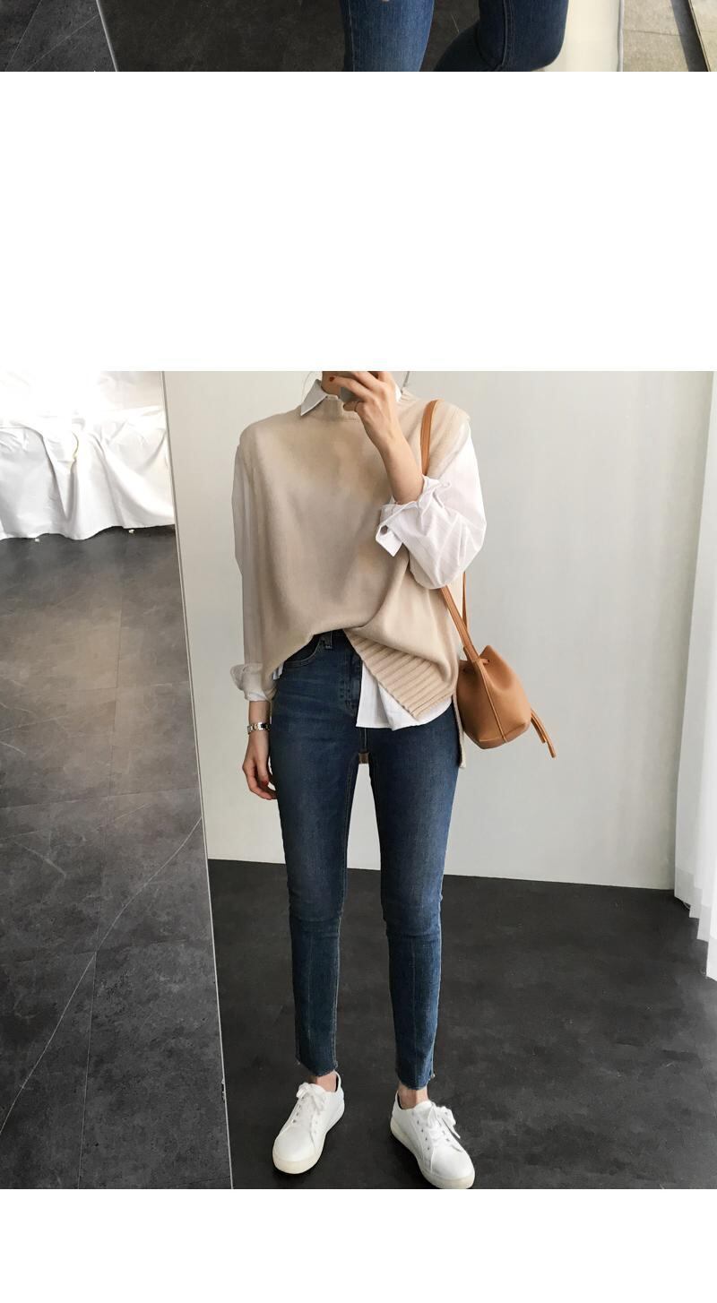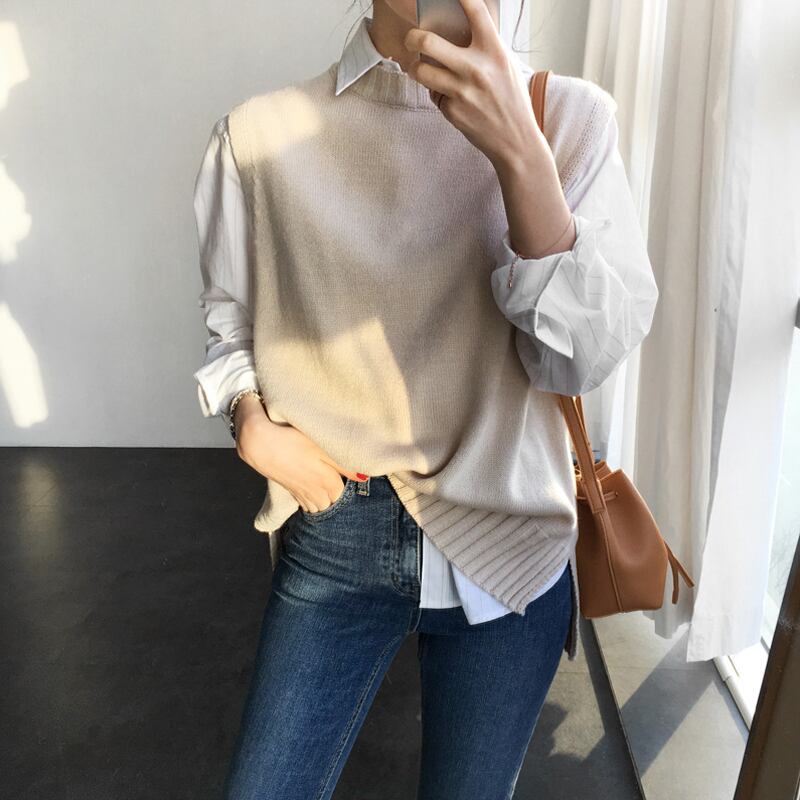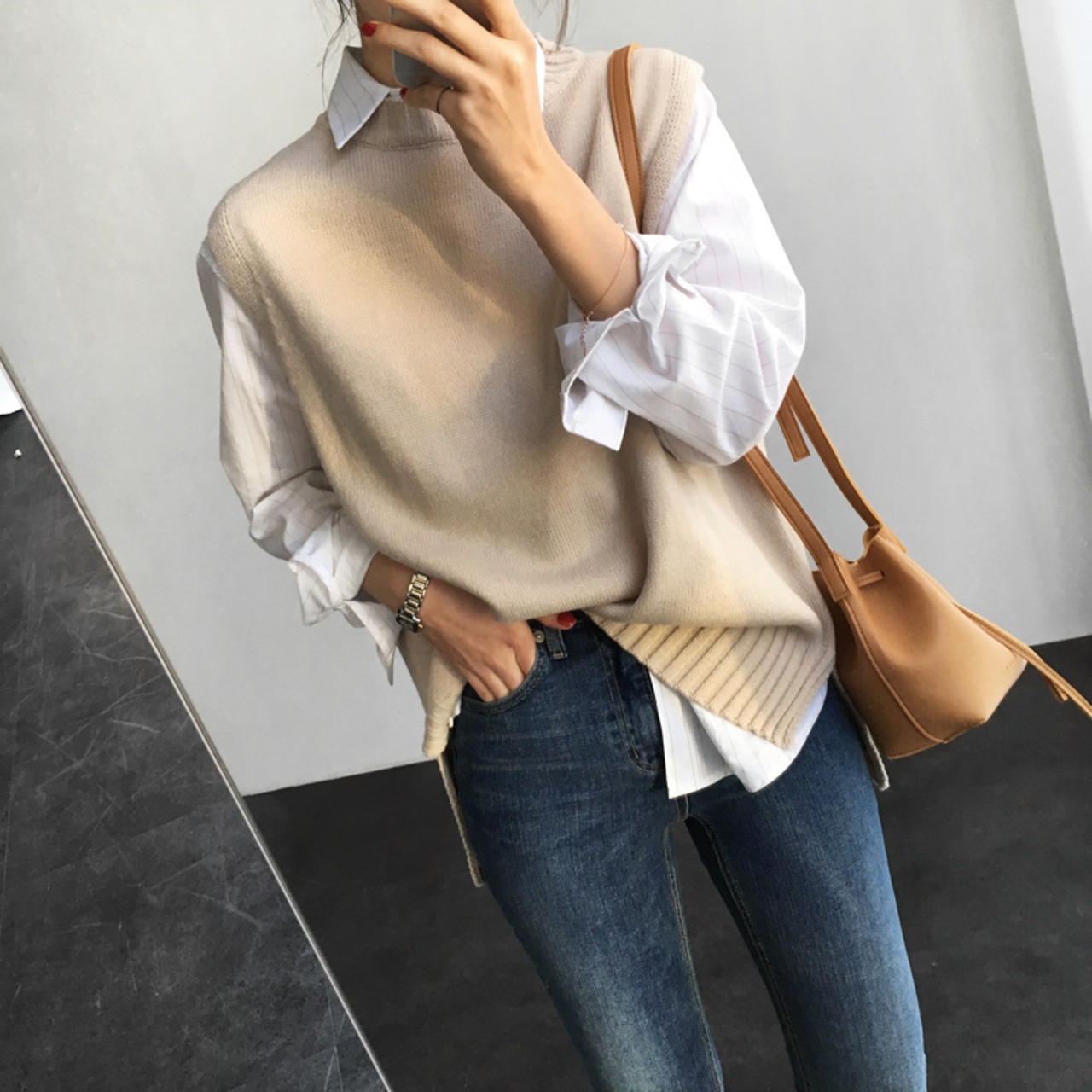 2019春レトロ香港風シックなラウンドネックベストベスト女子学生野生は薄いニットチョッキ女性 スプリング 春物 Oネック 左左右右_复古定制6259832