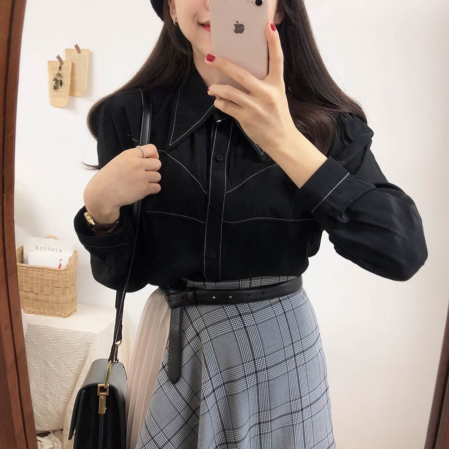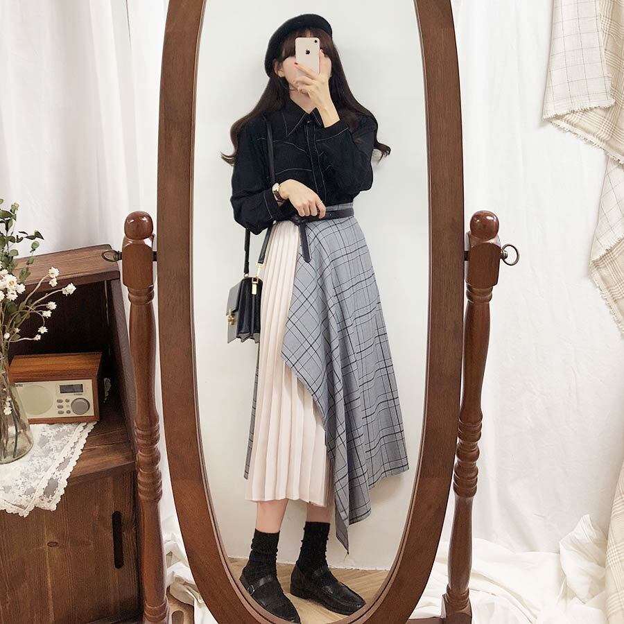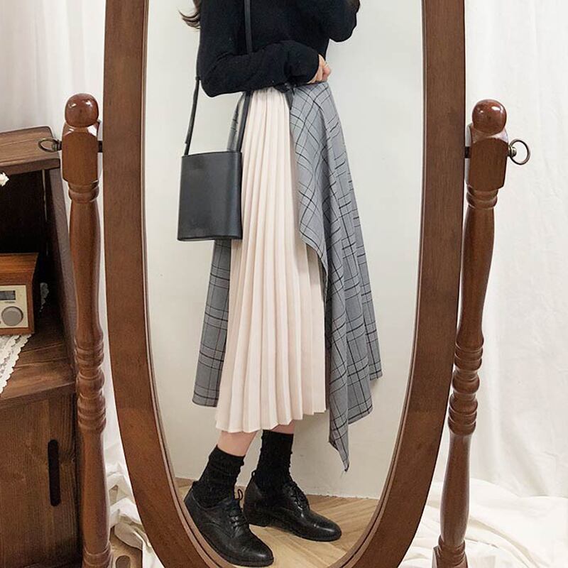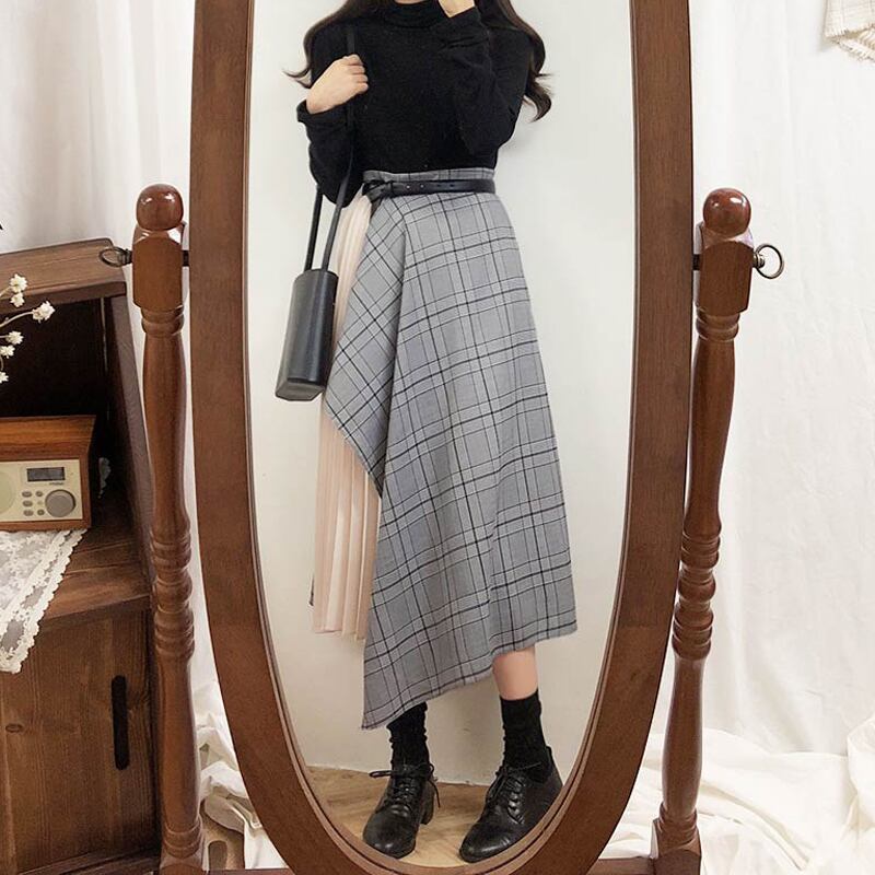 スプリングオータムスタンダードスカート ハイウェストウェスト格子柄レディース レトロ 春物 秋物 ステッチ 左左右右9315929