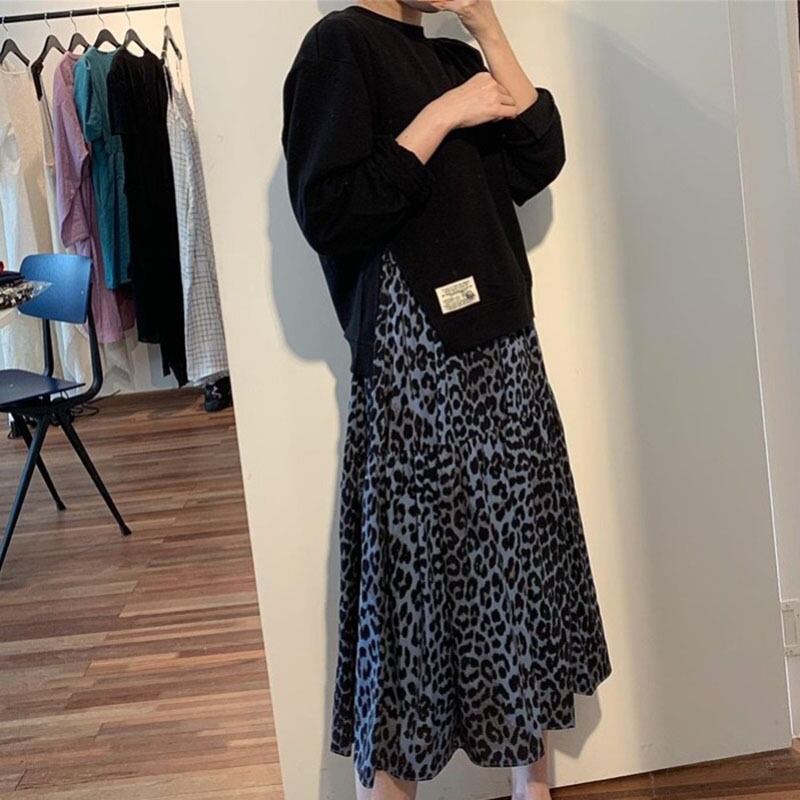ドレス オータムスタンダードレオパードスリットセーター スカート レトロ 秋物 ステッチ ICC_レディース0459558