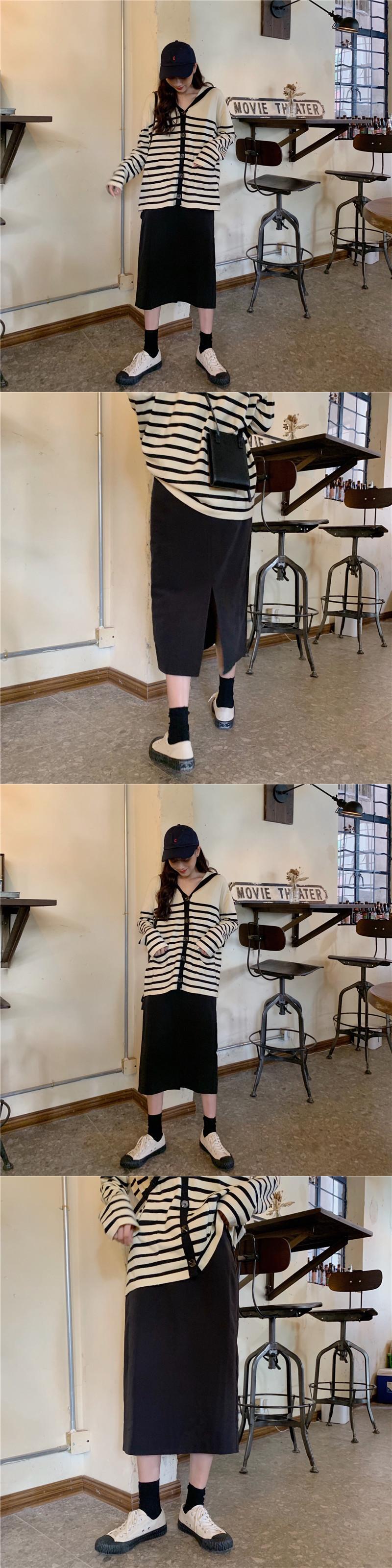 スタンダードオータムウィンタージャケット ニットカーディガンルーズストライプネイビーカラーセーター レトロ 秋物 冬物 左左右右3112692