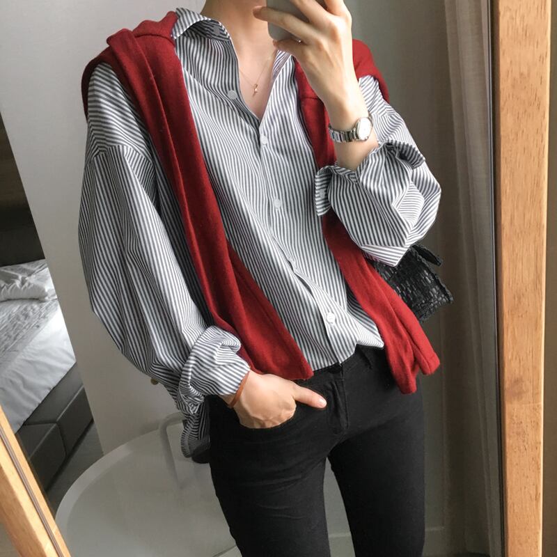 スプリングスタンダードルーズ薄手カーディガン長袖スリーブストライプシャツ ロング レトロ 春物 左左右右4145840