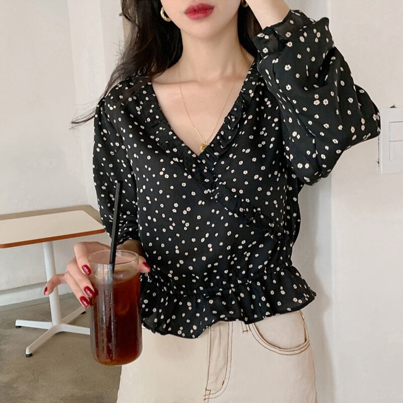 オータムスタンダードシャツ トップス ブラックフローラルVネック ロング レトロ 秋物 花柄 左左右右6154916