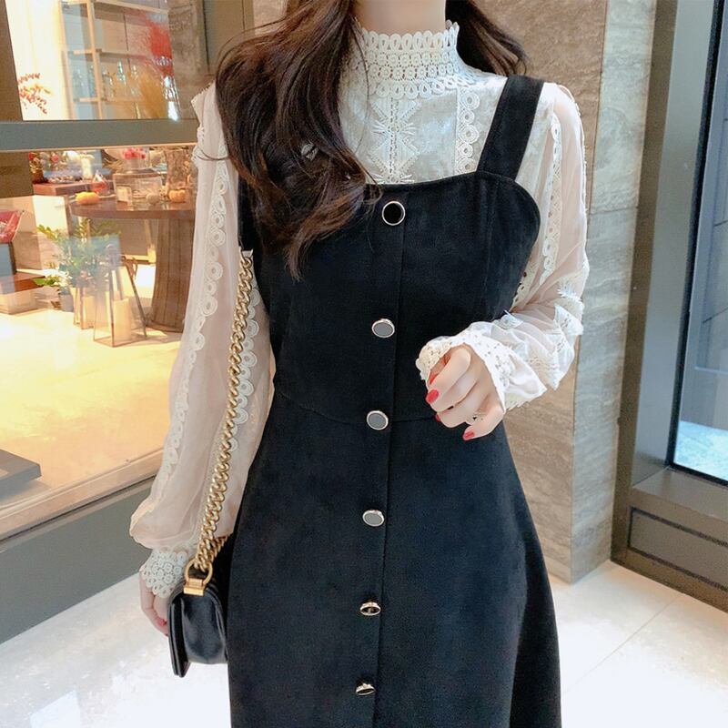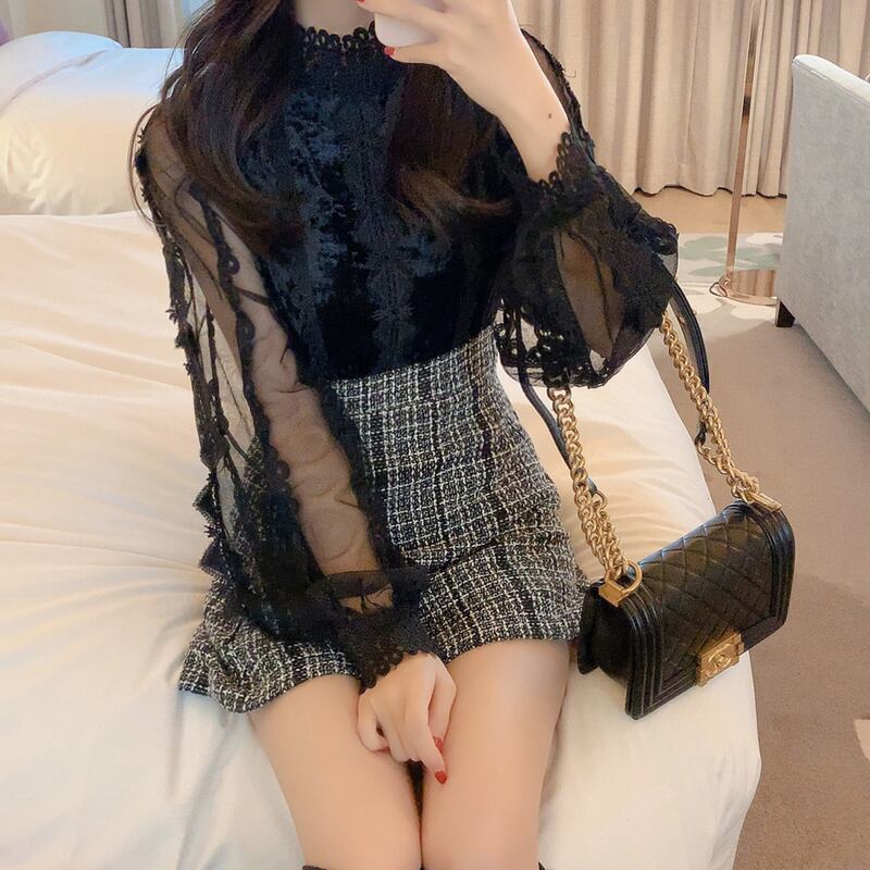 色:ブラックレースシャツ,白いレースのシャツ,黒のタンクスカート,カーディガンベストスカート